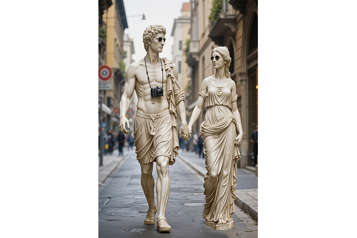 ai creation, ancient greek statues as modern tourists with sunglasses and a camera, ai art, art, kanvas tablo