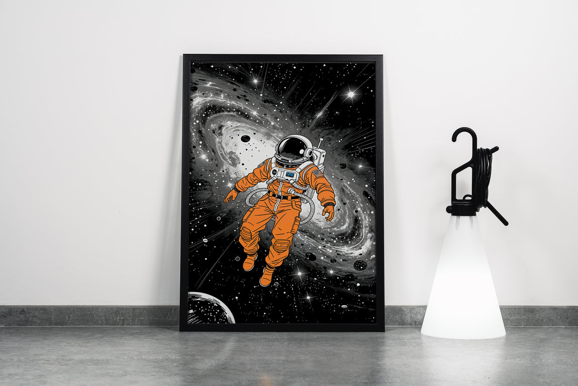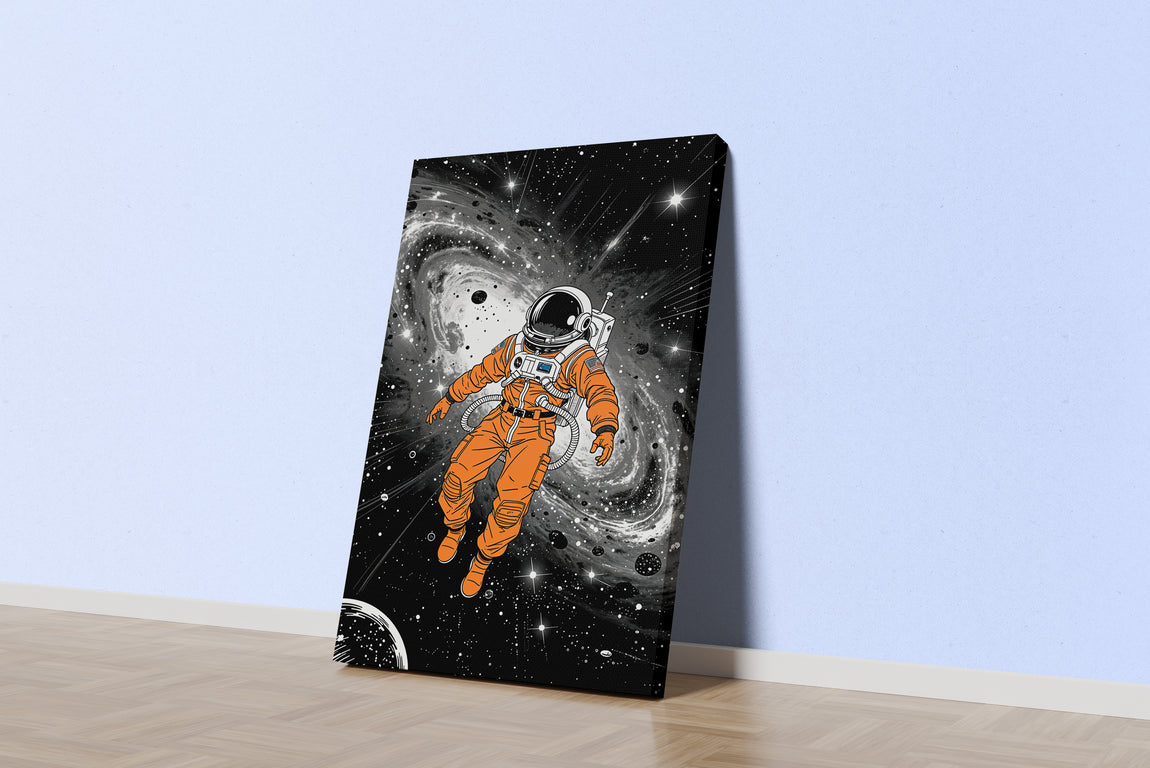 Uzayda mahsur kalmış turuncu uzay giysili bir astronot detaylarını taşıyan bu baskı, mekânsal derinliği ve canlı renkleriyle ortamınıza benzersiz bir hava katıyor. Yüksek kaliteli kanvas üzerine yapılan baskı, uzun ömürlü kullanım sağlar ve görsel etkisini korur. Modern tasarımıyla yaşam alanlarınıza hareket ve özgünlük getirir.