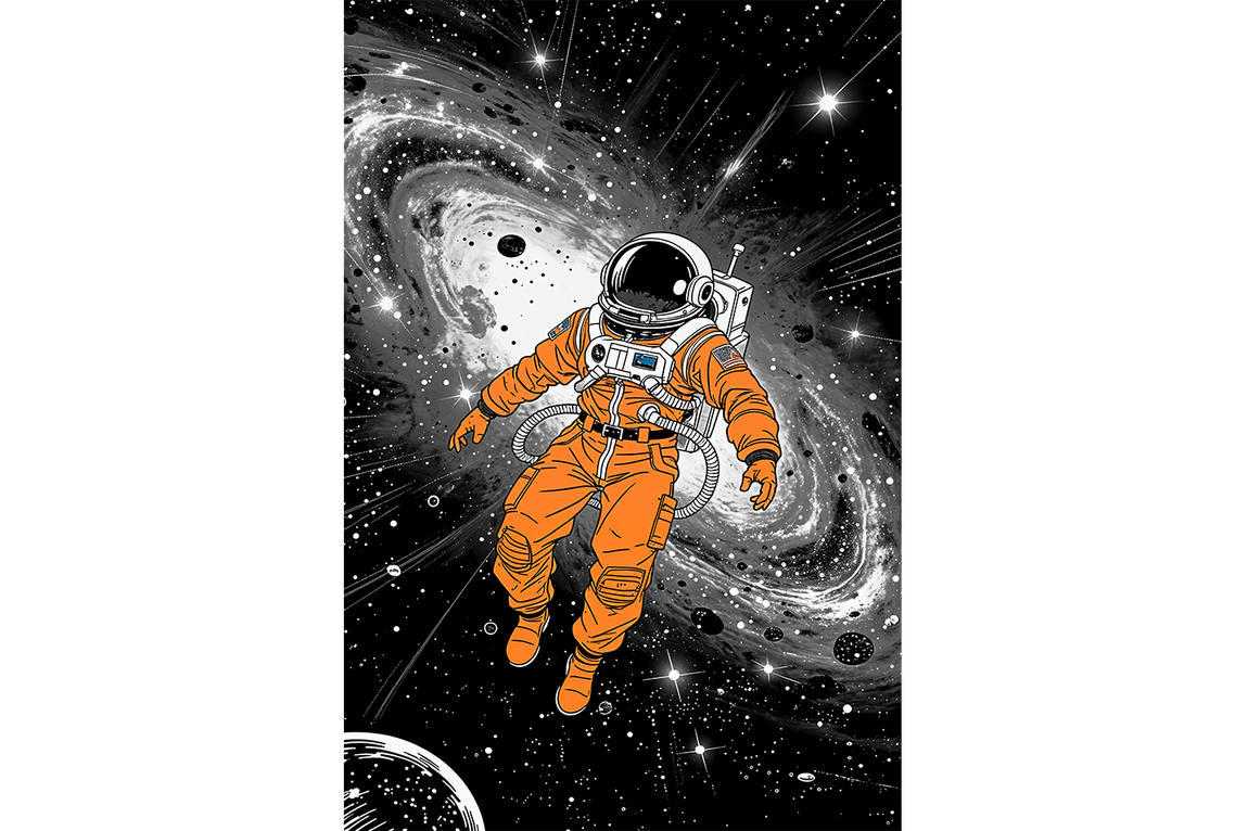 ai creation, astronaut in orange spacesuit stuck in space, ai art, art, kanvas tablo