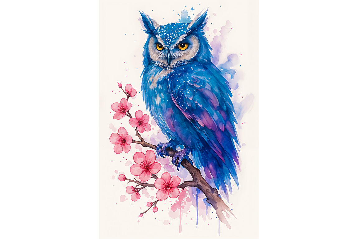 ai creation, blue toned owl standing on a branch, ai art, art, kanvas tablo