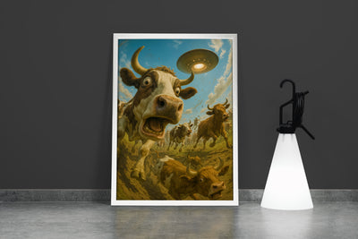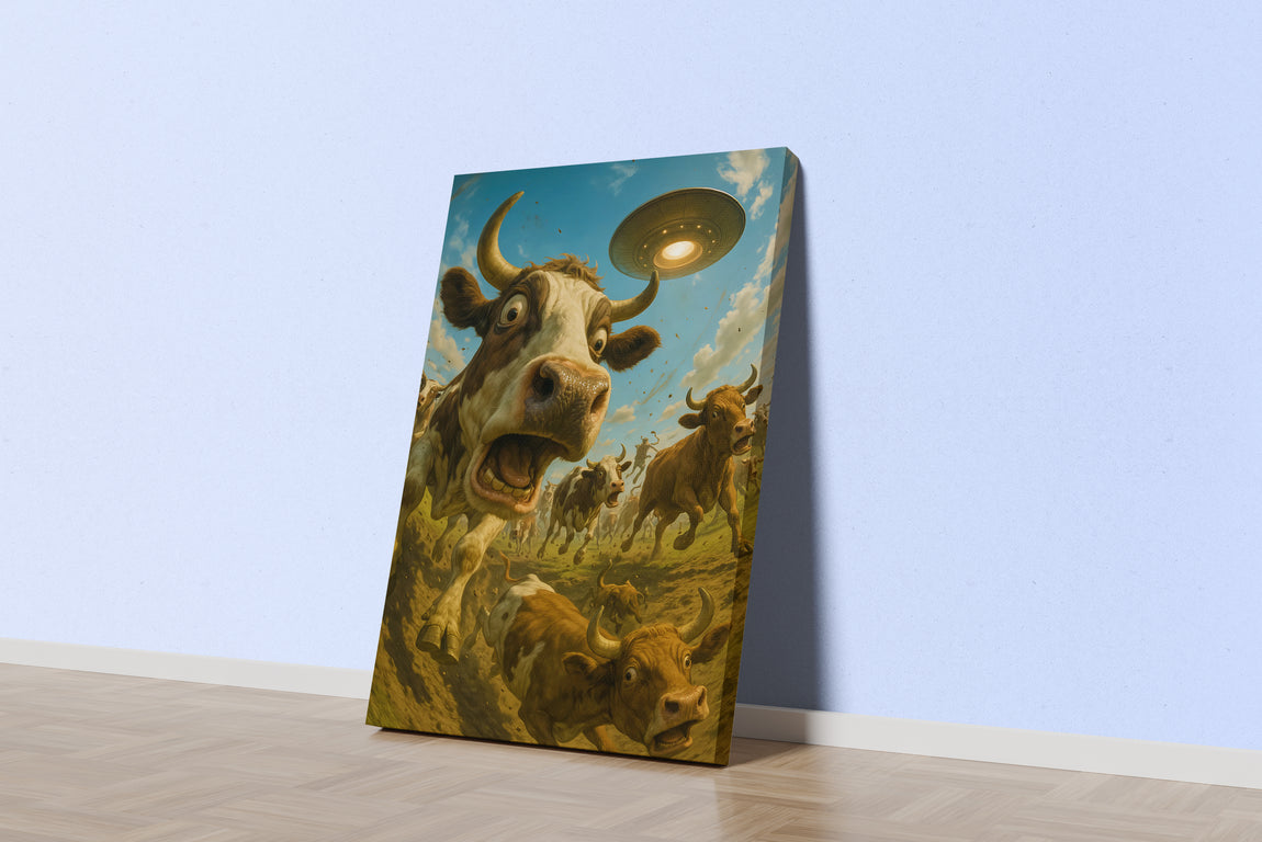 Uzaylı saldırısından kaçan ineklerin canlı ve detaylı baskısıyla yaşam alanınıza özgünlük katın. Yüksek kaliteli kanvas materyali üzerine yapılan baskı, uzun ömürlü ve dikkat çekici bir görsel sunar. Ev veya ofis dekorasyonunuza hareket ve farklı bir atmosfer kazandırmak için ideal bir seçim.