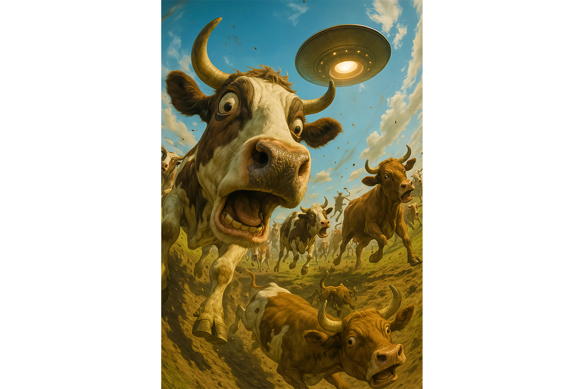 ai creation, cows escaping alien attack, ai art, art, kanvas tablo