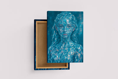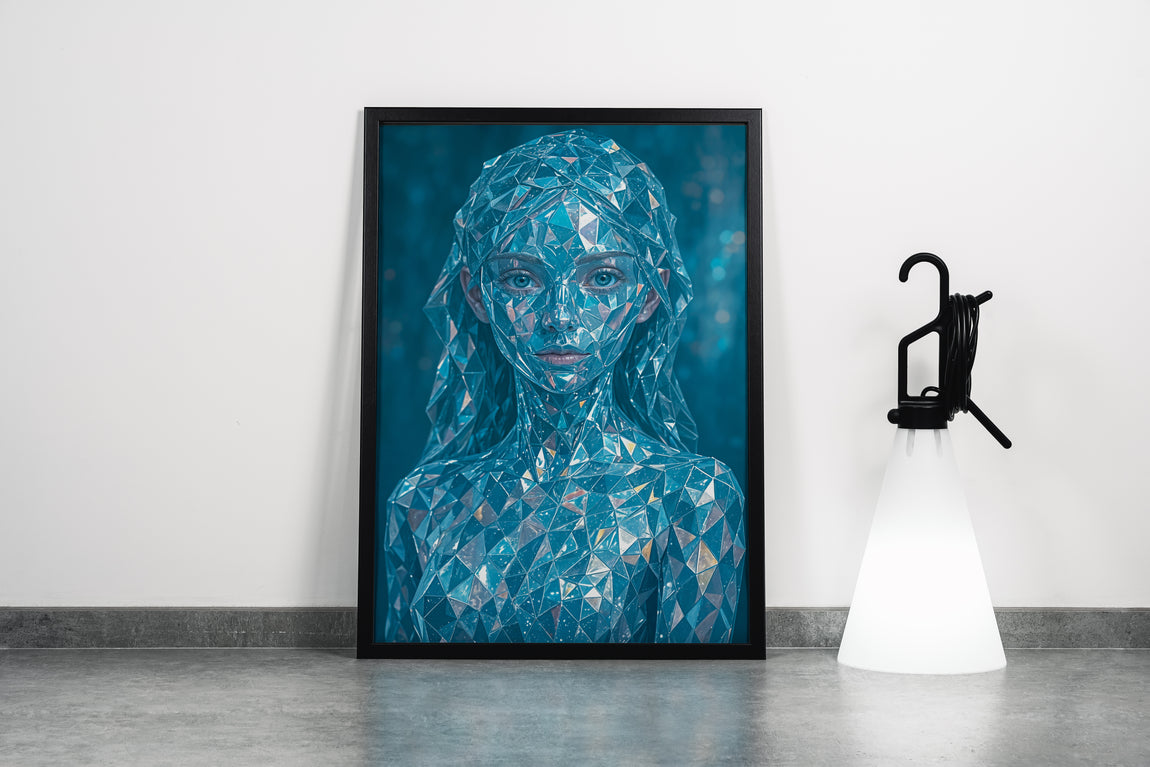 Soyut mavi parçalardan oluşan geometrik detaylarla çevrili, kristal hissi veren kadın portresi baskısı, mekanınıza modern ve etkileyici bir atmosfer katıyor. Yüksek kaliteli baskı tekniği sayesinde canlı renkler ve ışıldayan efektler uzun süre korunur. Estetik ve teknoloji sentezini evinize taşıyan bu eser, dikkat çekici ve zarif bir dekorasyon tercihi sunar.