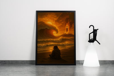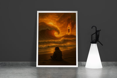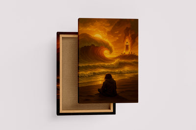 ai creation, girl watching giant waves crashing onto the beach fire themed, ai art, art, kanvas tablo