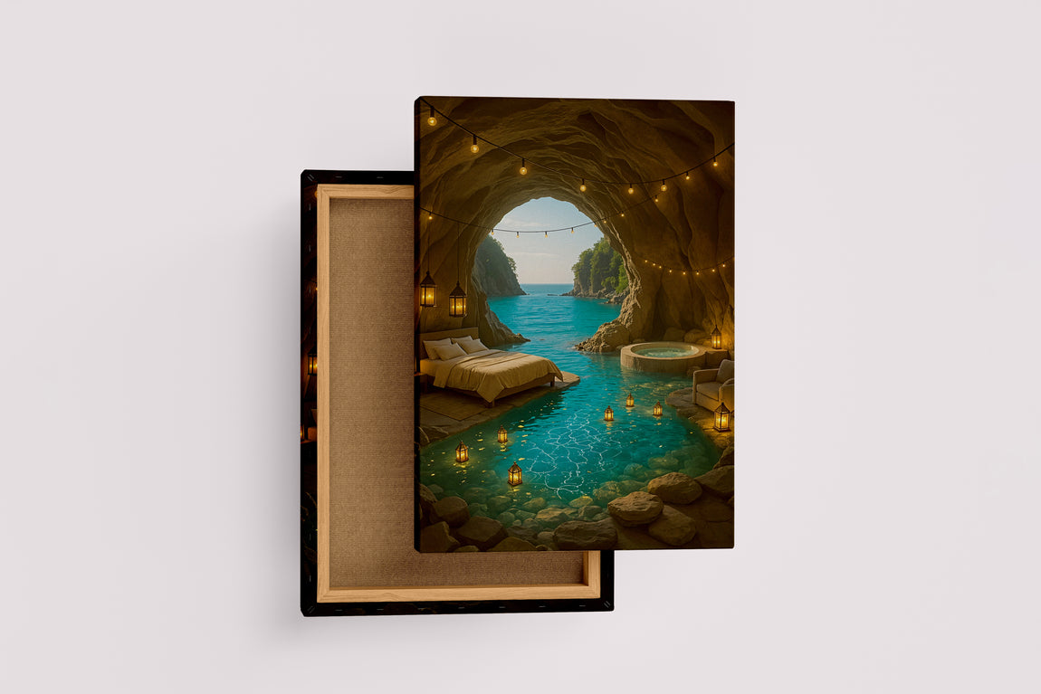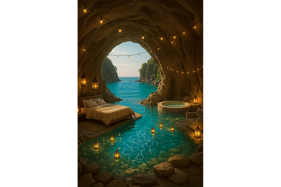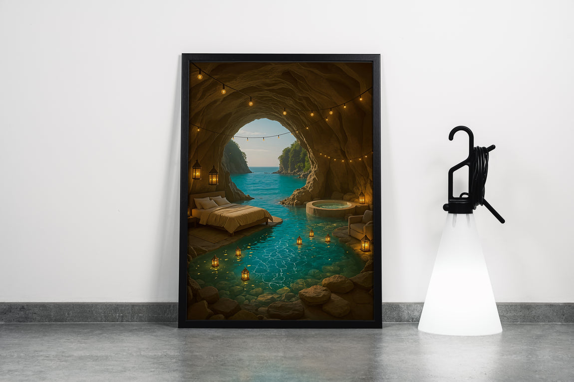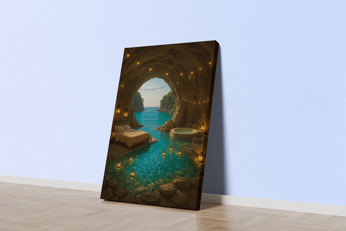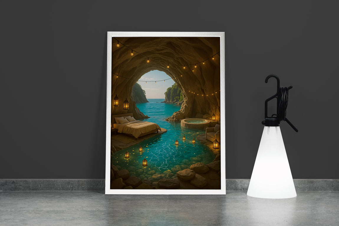 ai creation, hotel room inside the cave and sea view model 2, ai art, art, kanvas tablo