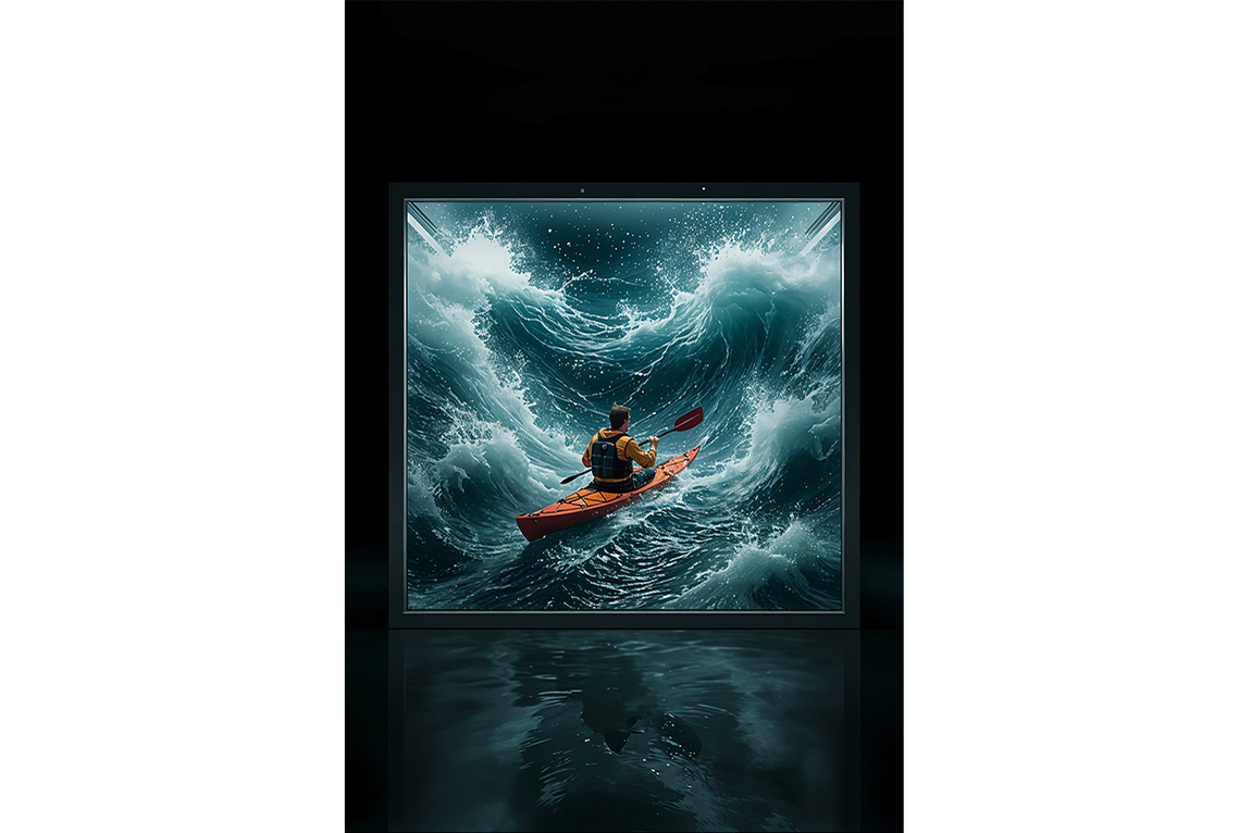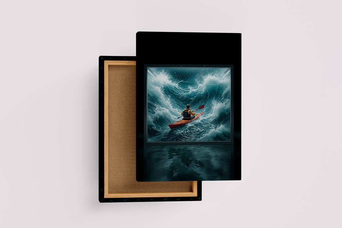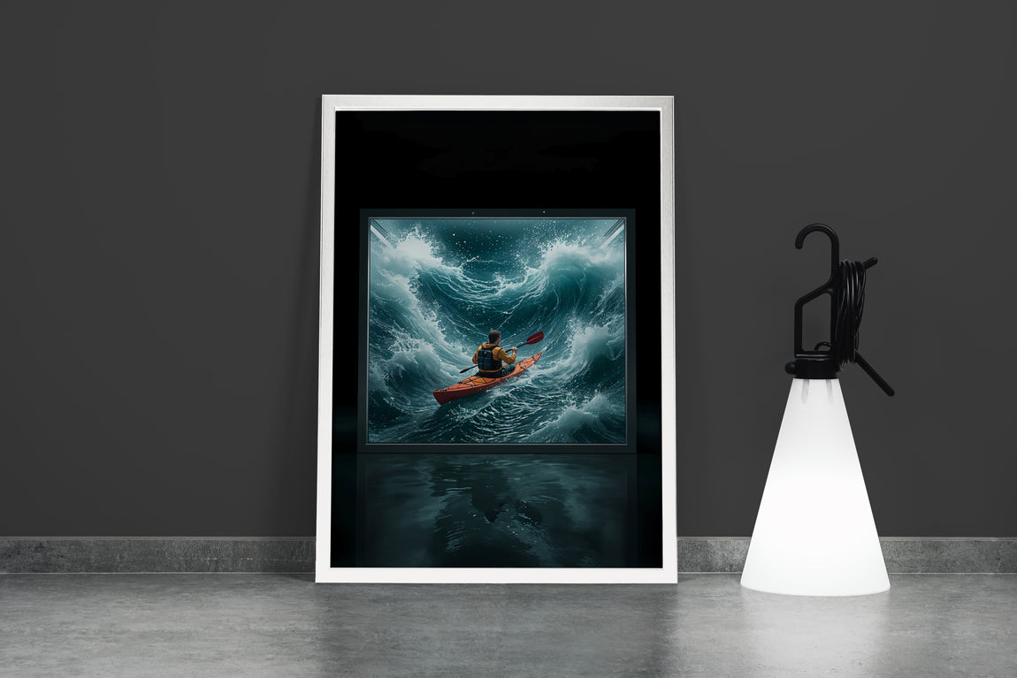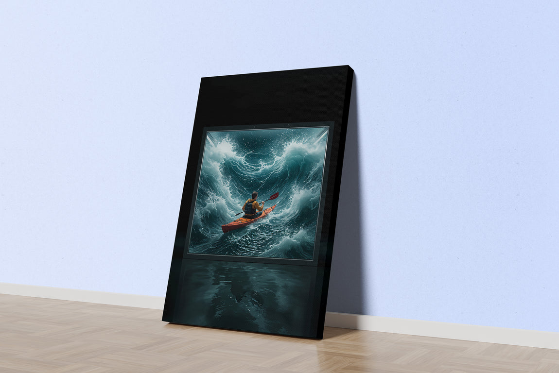 ai creation, kayaker battling huge stormy waves, coming out of a screen, ai art, art, kanvas tablo