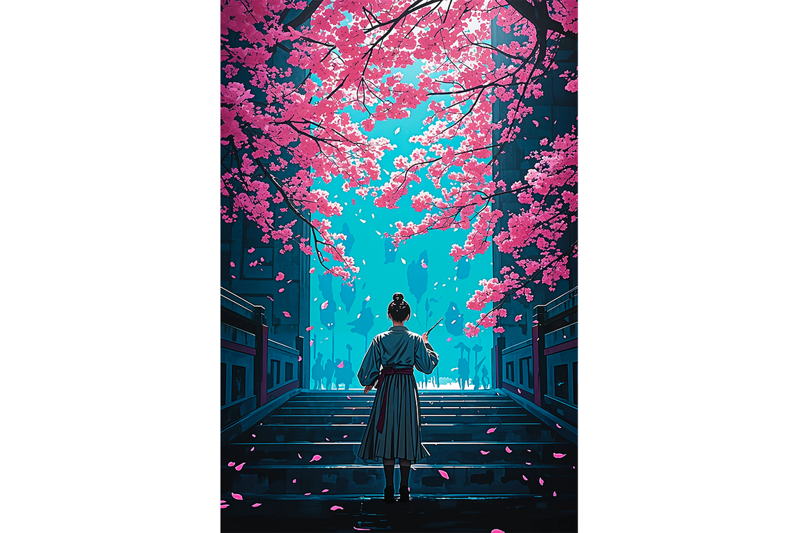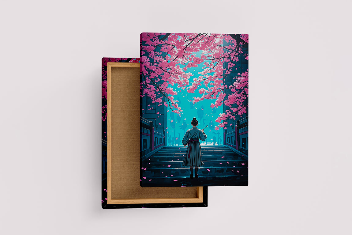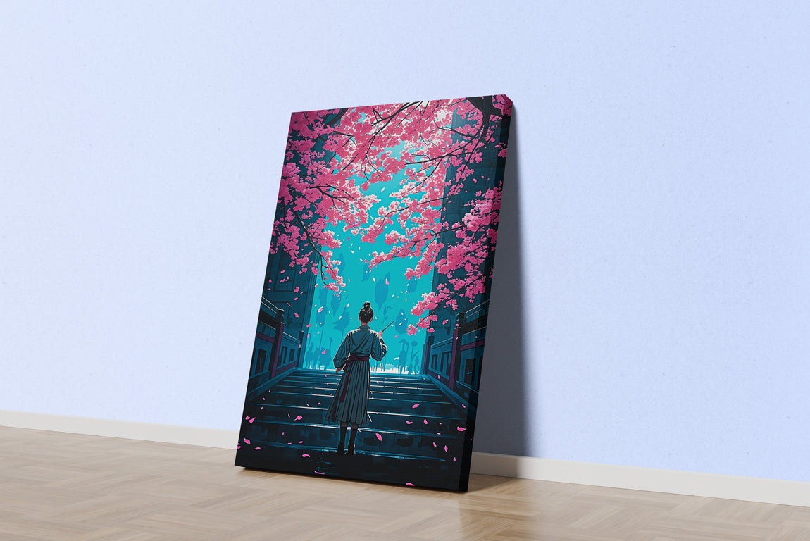 ai creation, master kung fu climbs stairs while pink leaves fall, ai art, art, kanvas tablo