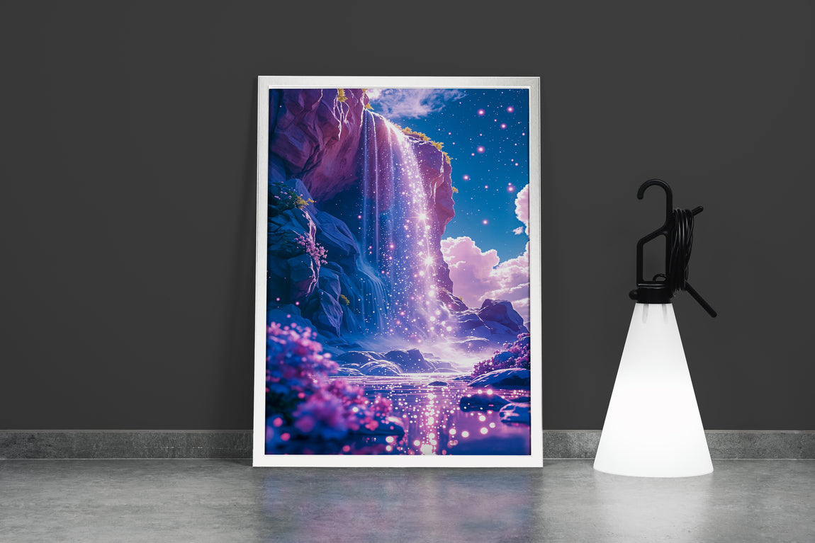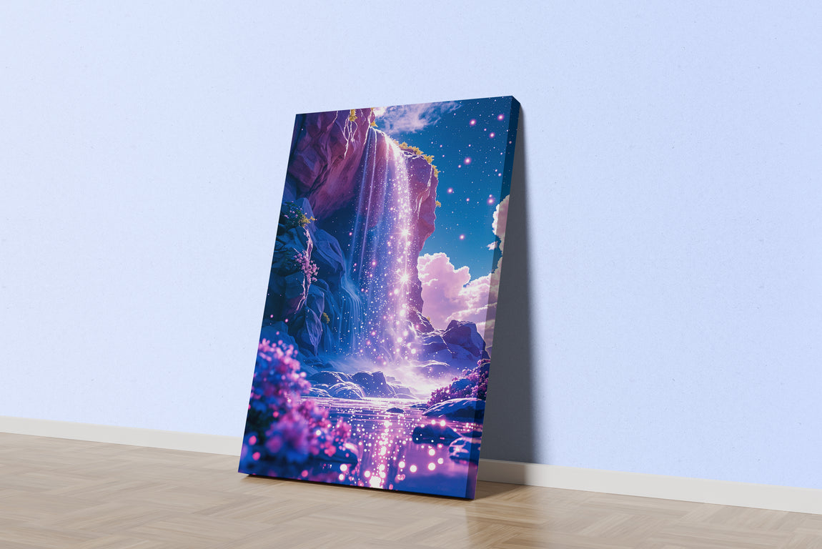 ai creation, purple waterfall with stars flowing, purple and its shades themed, ai art, art, kanvas tablo