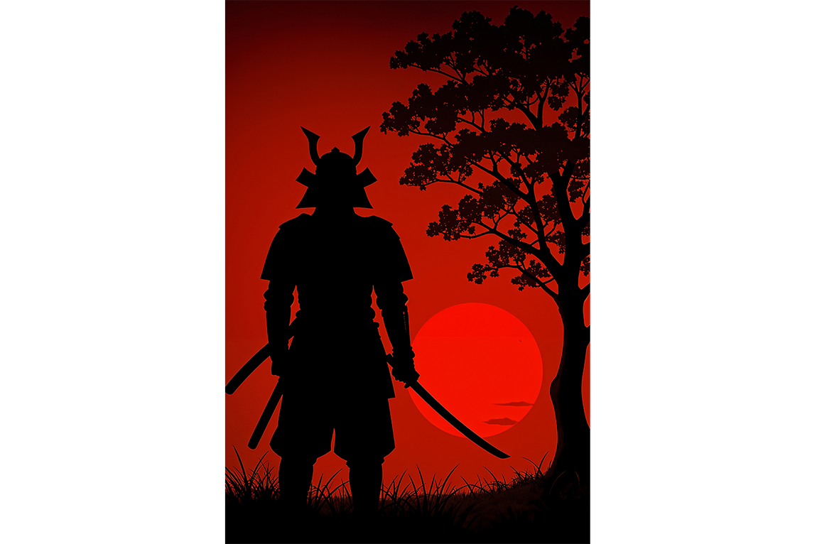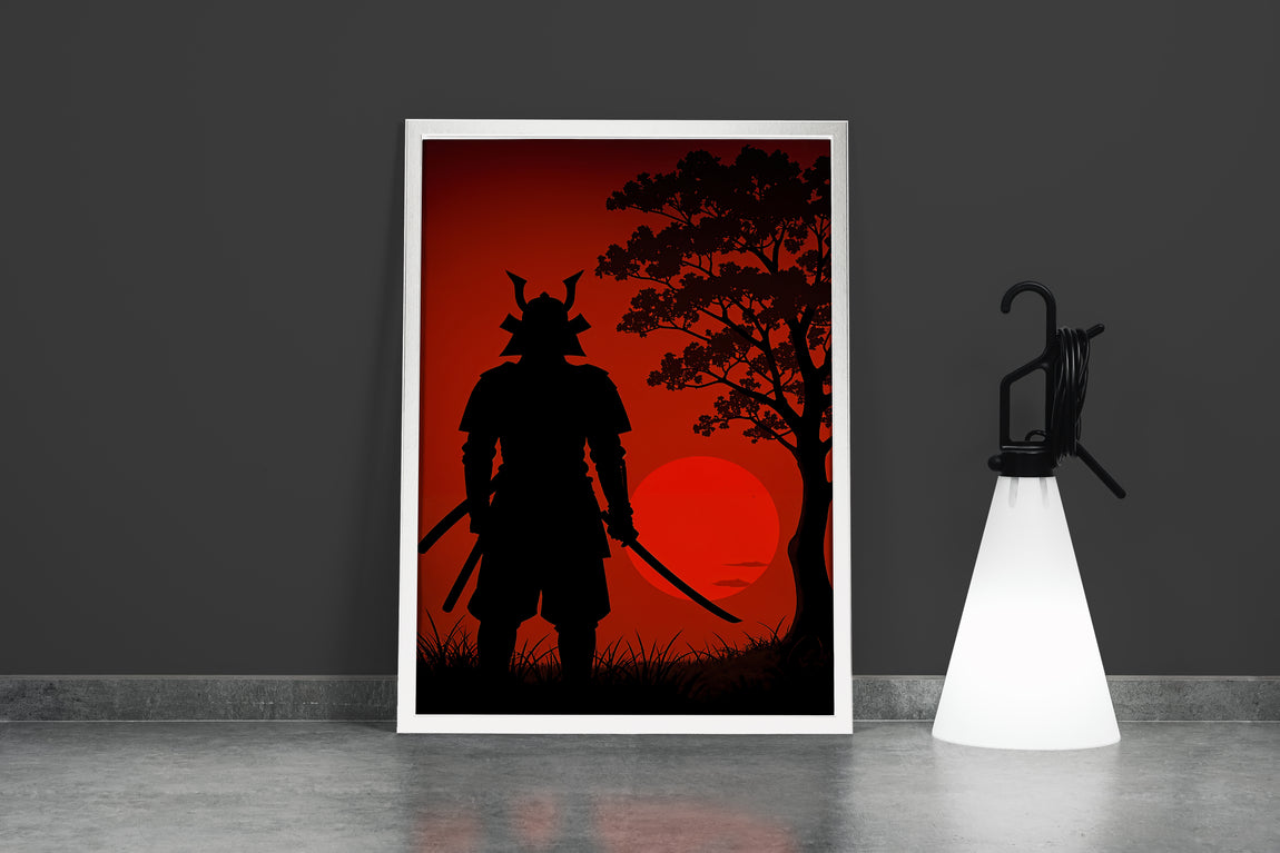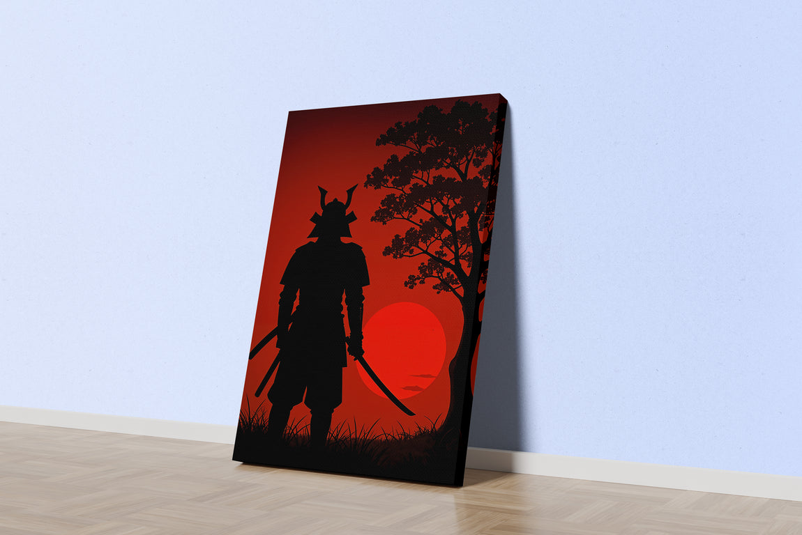 ai creation, samurai watching the sunset, sunset in red tones, ai art, art, kanvas tablo