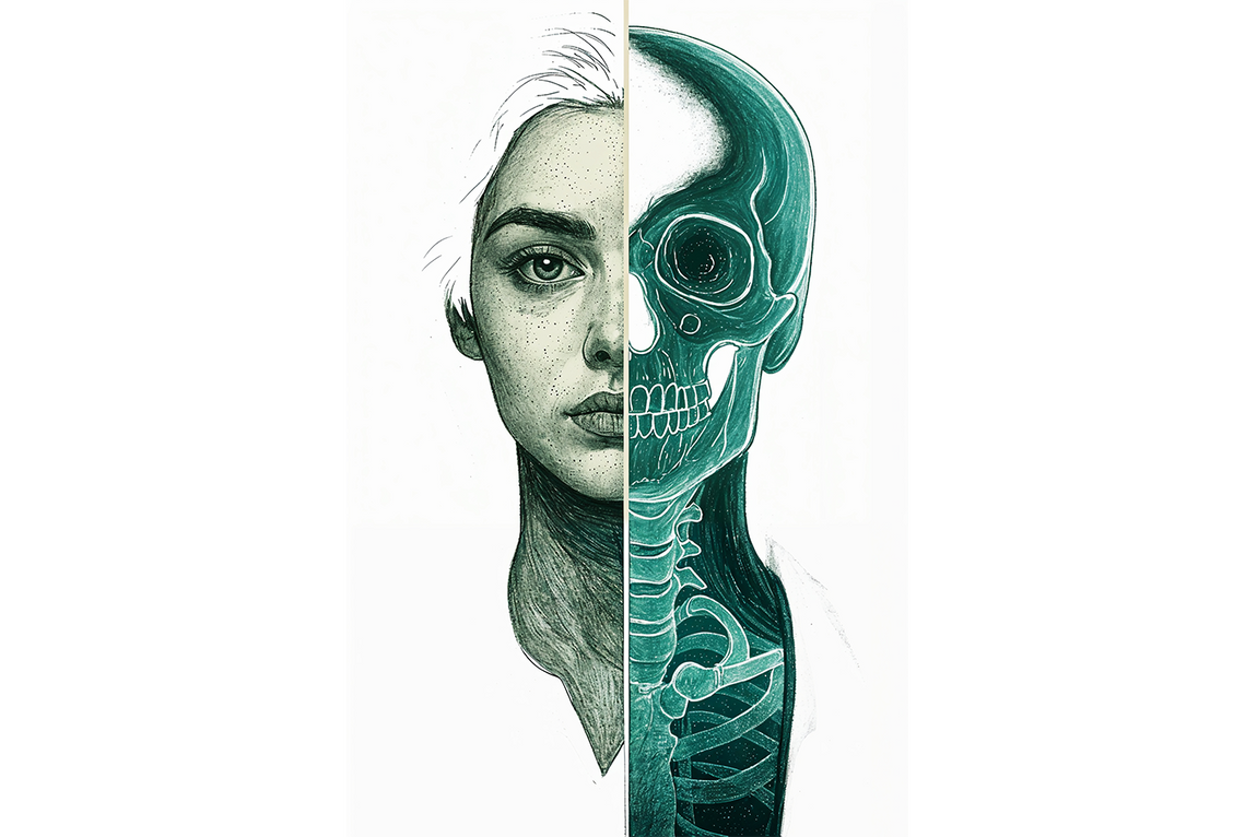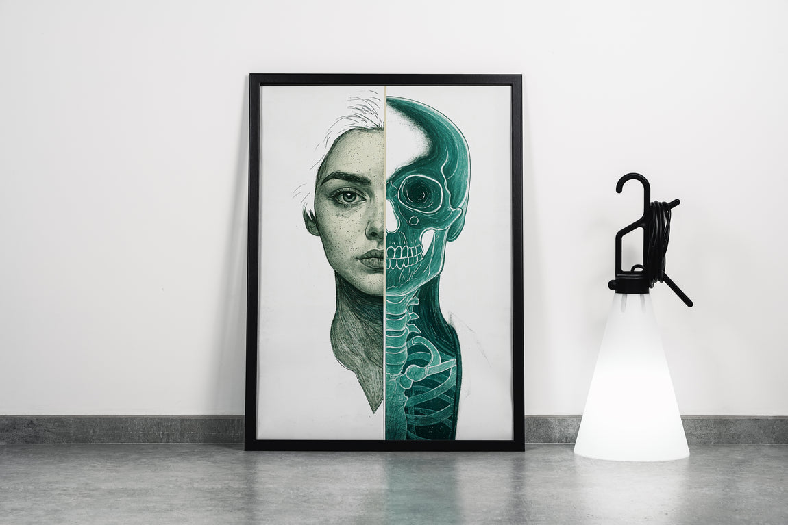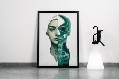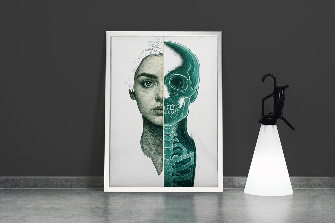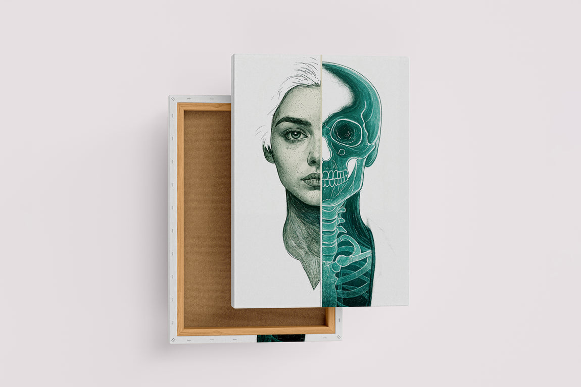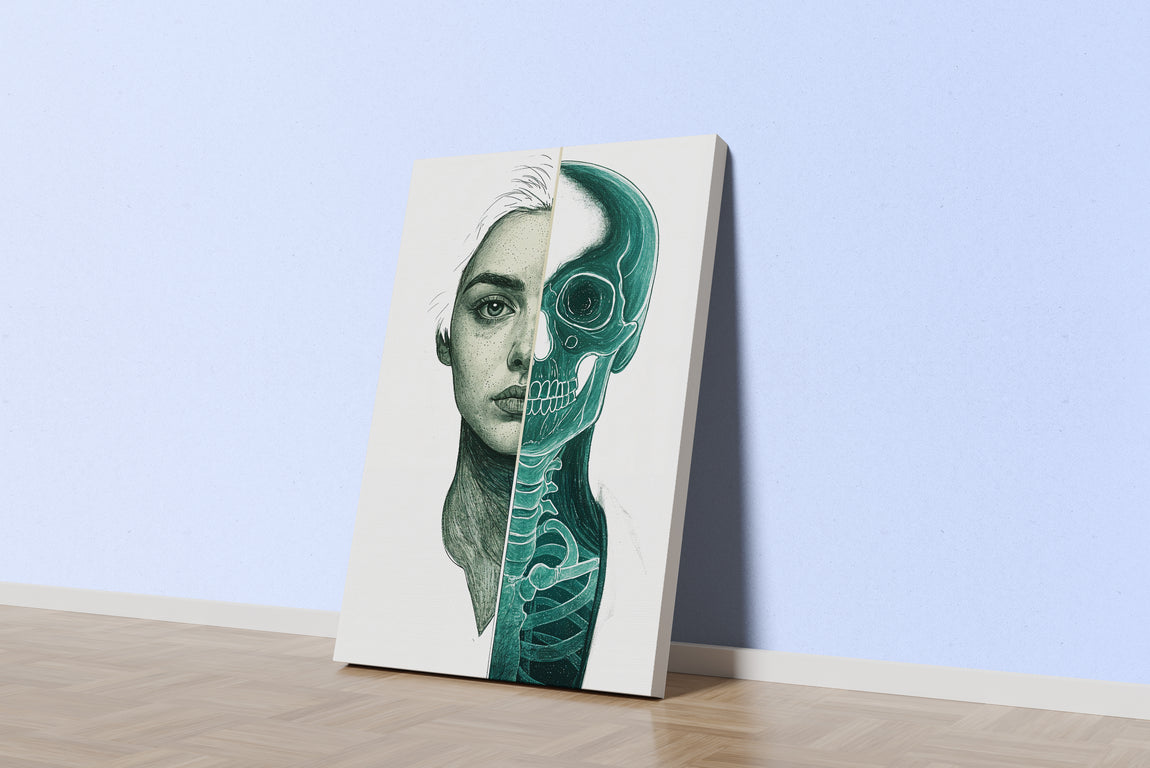 ai creation, split illustration of a woman's face showing the teal skeleton anatomy underneath, ai art, art, kanvas tablo