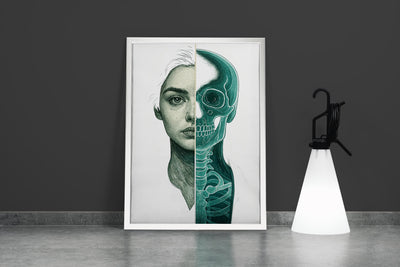 Yüksek çözünürlüklü baskı kalitesiyle, zarif ve özgün bir görsel sunar. Yüz hatlarının içindeki turkuaz renkli iskelet anatomisi detayları, sanatseverler için çarpıcı ve modern bir tarz yaratır. Dekorasyonunuza derinlik ve dikkat çekici bir estetik katmak için ideal bir seçenektir. Dayanıklı malzemesi sayesinde uzun ömürlü kullanım sağlar.