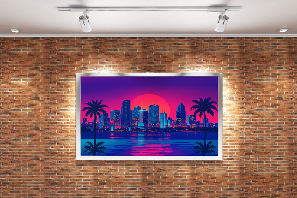 ai creation, sunset in a retrowave and cyberpunk looking city, ai art, art, kanvas tablo
