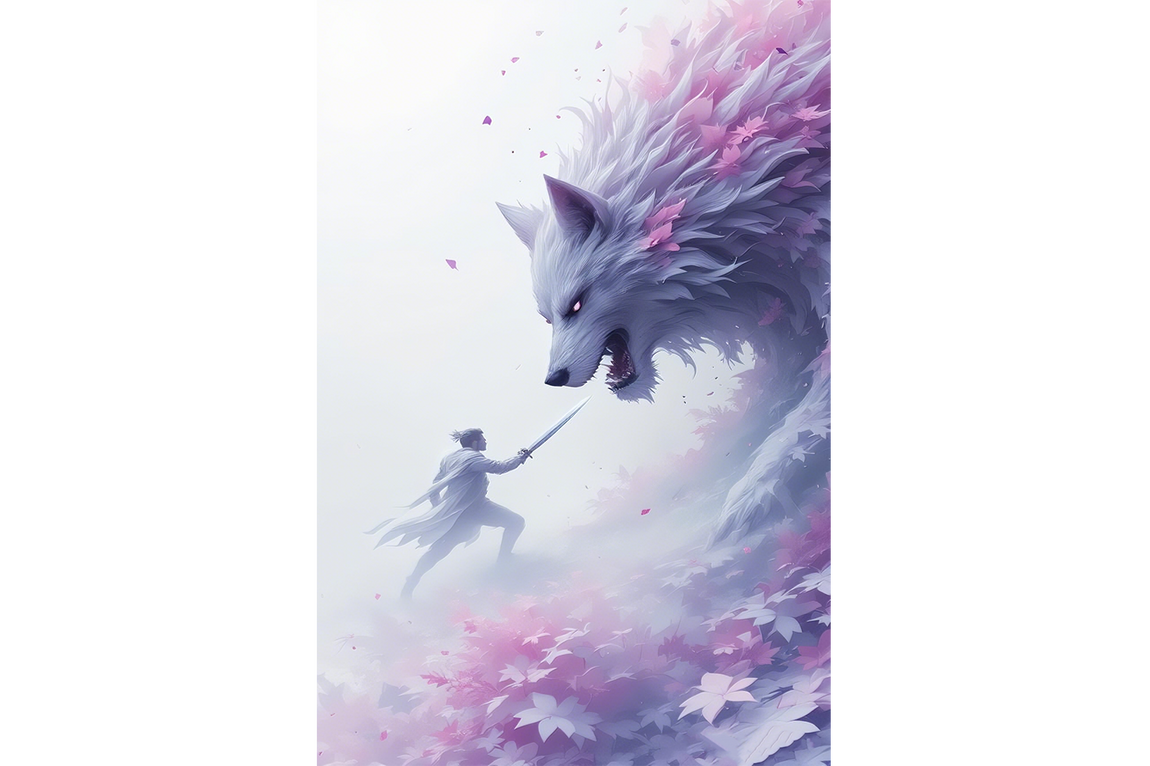 ai creation, swordsman vs wolf, pet, ai art, art, kanvas tablo