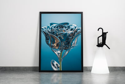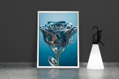 ai creation, the rose and its leaves are made of silver, in muted blue tones model 2, ai art, art, kanvas tablo