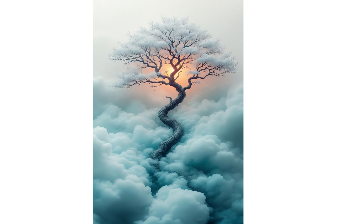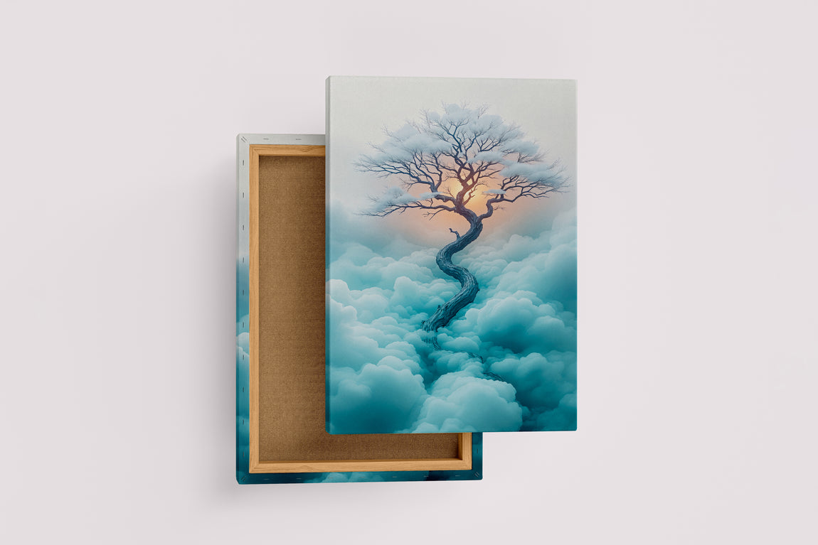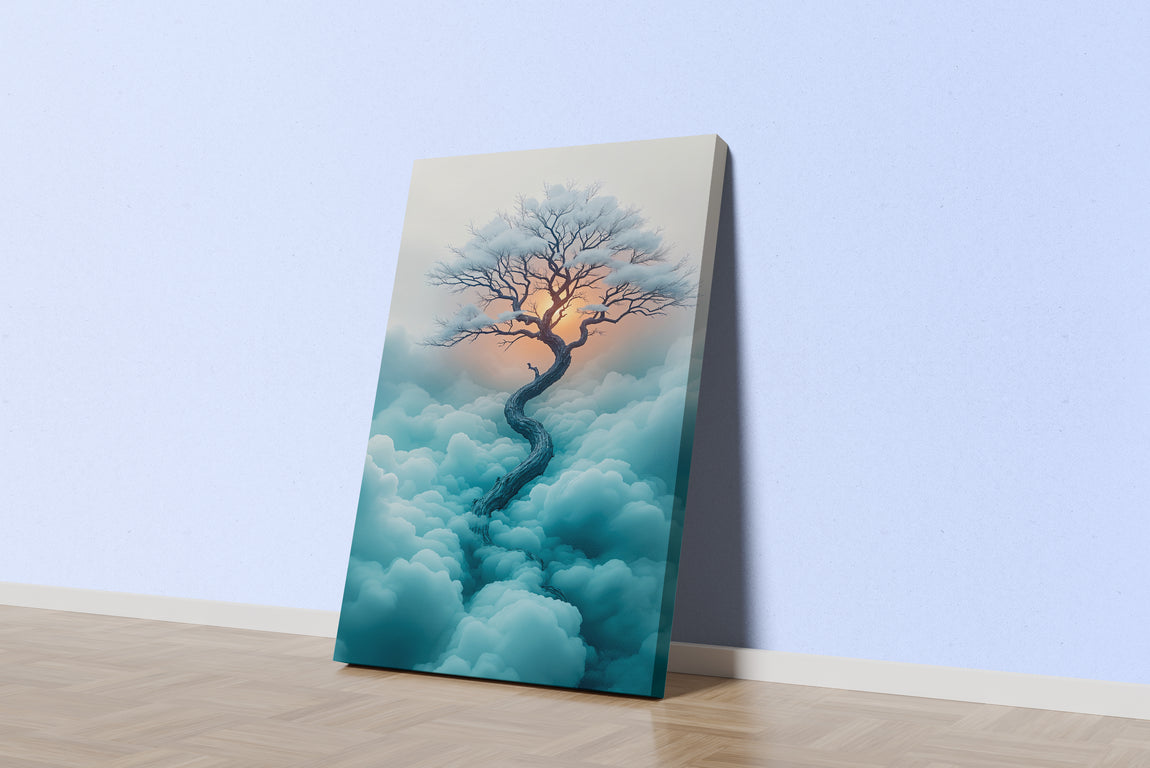 ai creation, tree growing above the clouds at sunset, ai art, art, kanvas tablo