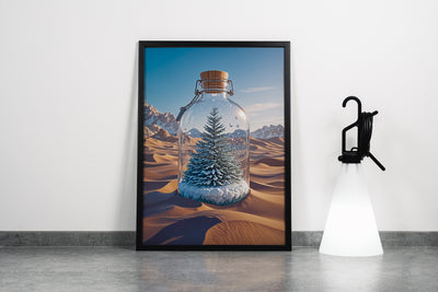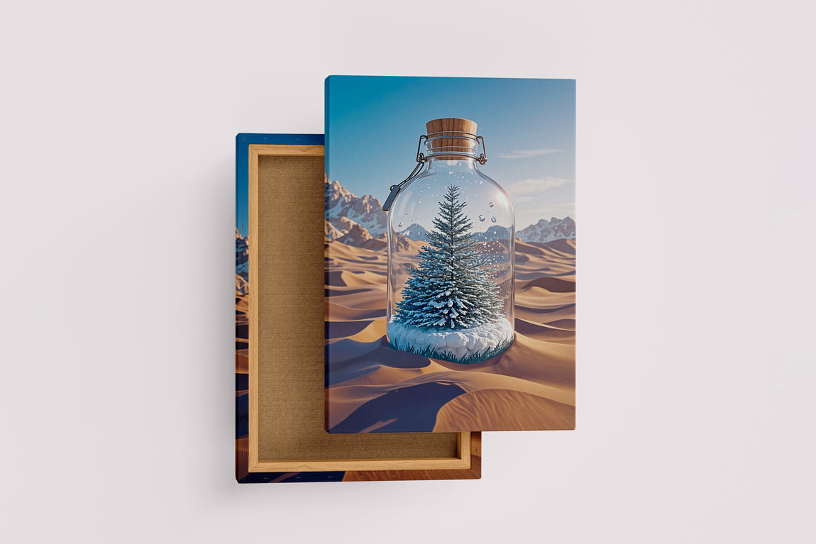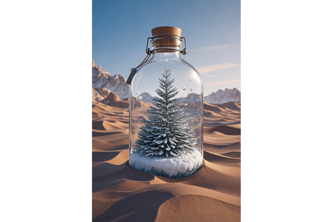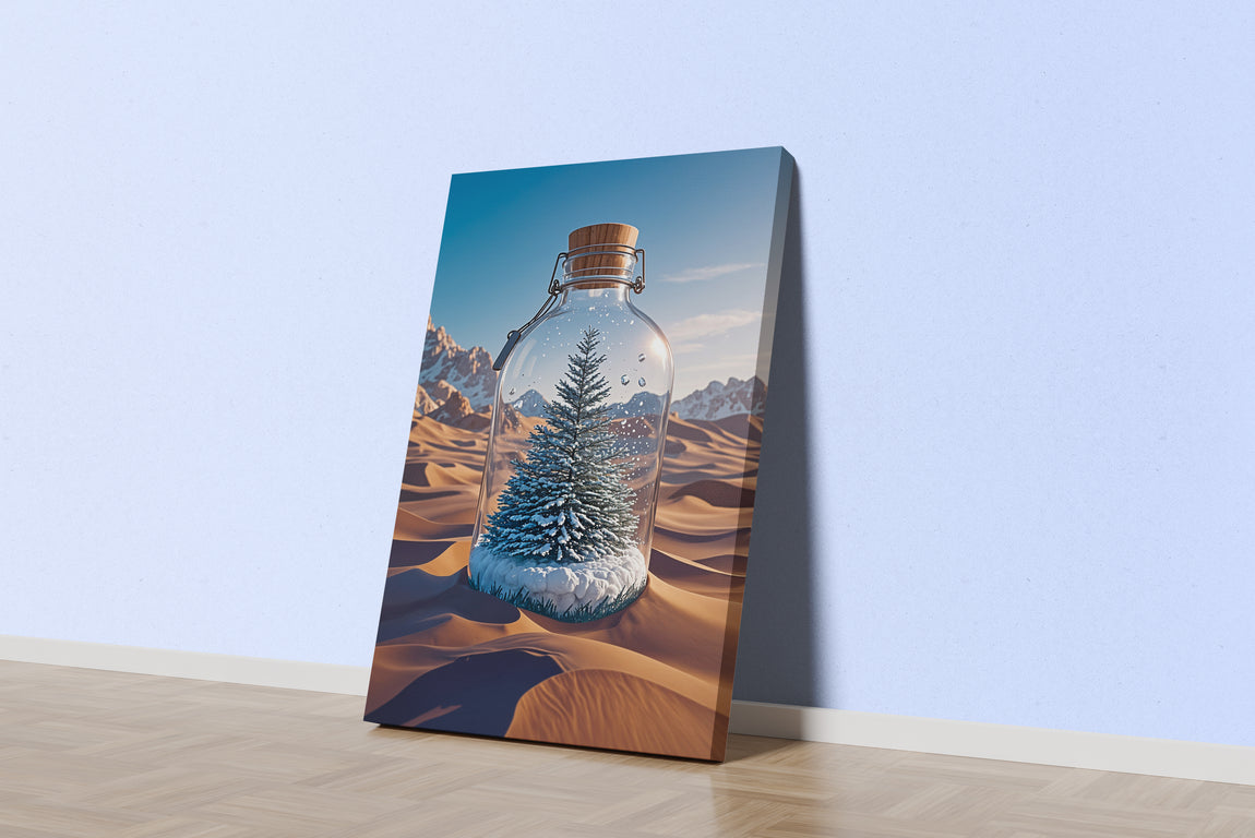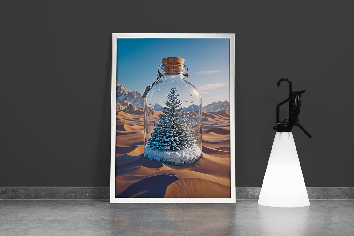 ai creation, tree standing on snow in the desert, stuck in a bottle, ai art, art, kanvas tablo