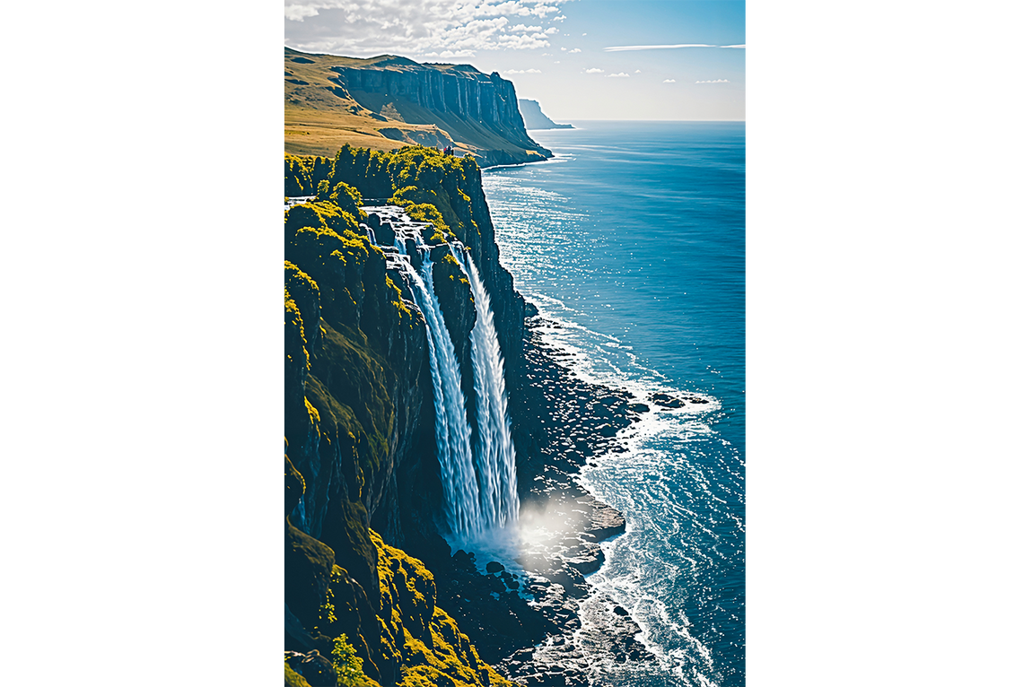 ai creation, waterfall flowing from a cliff into the sea, ai art, art, kanvas tablo