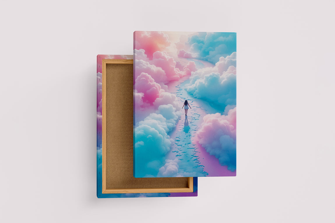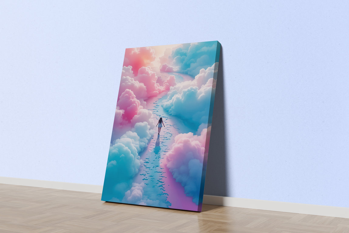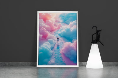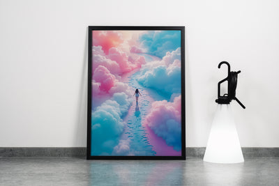Yoğun mavi ve pembe bulutlar arasında yürüyen kadın figürünün detaylı ve özgün baskısı, mekanınıza derinlik ve hayal gücü katıyor. Canlı renkler ve net detaylar, her ortamda dikkat çekici bir atmosfer yaratmanıza olanak sağlar. Kaliteli baskı tekniği sayesinde uzun ömürlü ve dayanıklı bir görsel deneyim sunar. Dekorasyonunuza zarif ve modern bir dokunuş eklemek için ideal bir seçim.
