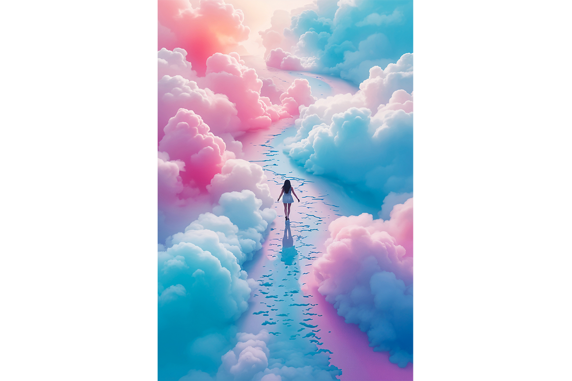 ai creation, woman walking among blue and pink clouds, ai art, art, kanvas tablo