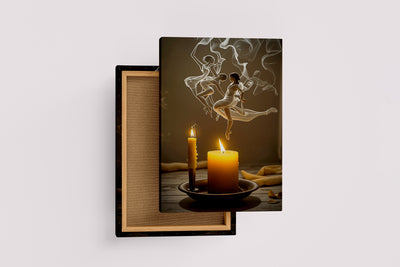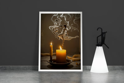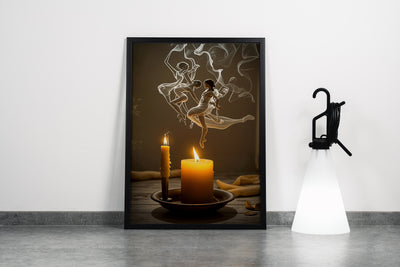 Kadın figürünün zarif hareketleri, yanan mumların dumanıyla birleşerek etkileyici bir görsel hikaye sunuyor. Yüksek kaliteli baskısı, detaylardaki inceliği ve renklerin canlılığını ortaya çıkarırken, ortamınıza sofistike bir dokunuş katıyor. Sanatsal atmosfer yaratmak isteyenler için ideal bir tercih.
