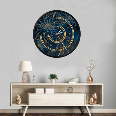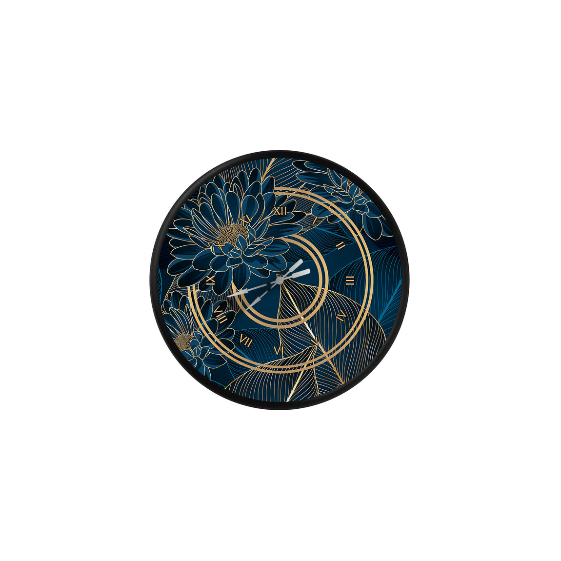 altın çizgili lacivert çiçek deseni, MDF duvar saati