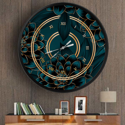 altın çizgili petrol yeşili çiçekler, MDF duvar saati