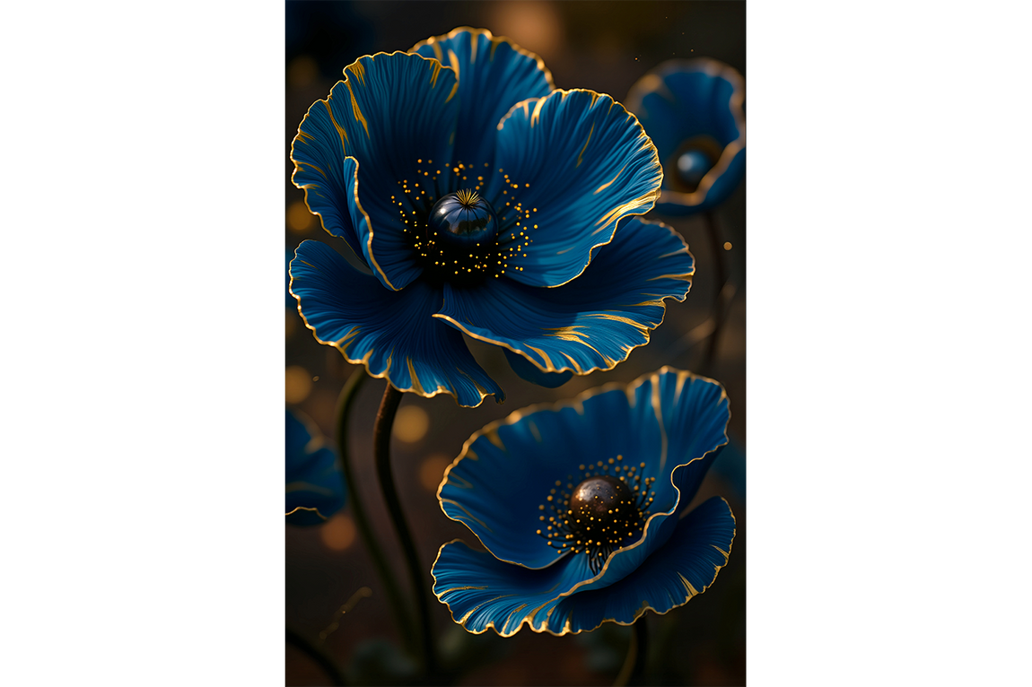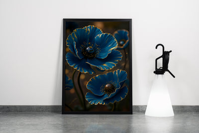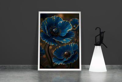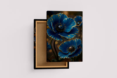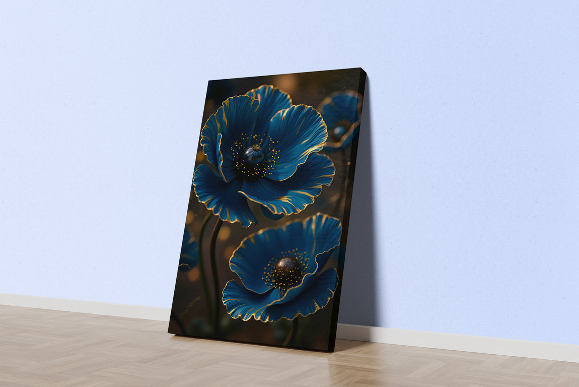 Doğanın zarafeti ile lüks tasarımın büyüleyici birleşimini sunan bu eser, şimdi mekanlarınıza sofistike bir dokunuş ve dramatik bir güzellik katmak için kanvas tablo formunda. Bu tablo, sadece bir çiçek resmi değil, aynı zamanda her bir taç yaprağı altınla bezenmiş, derin mavi gelinciklerin o gizemli ve asil duruşunu yansıtan, modern ve lüks bir sanat yorumudur.