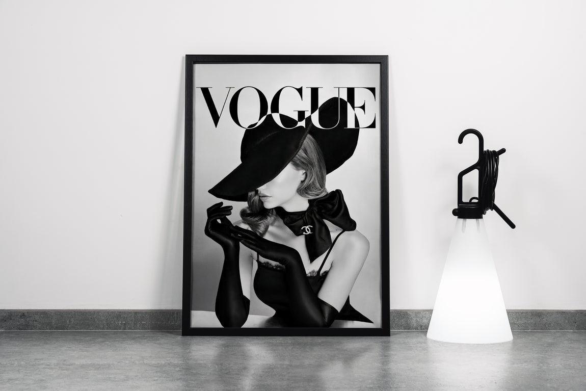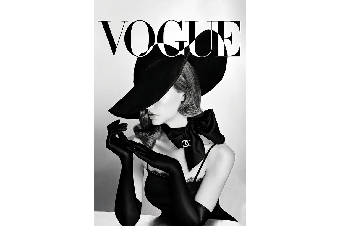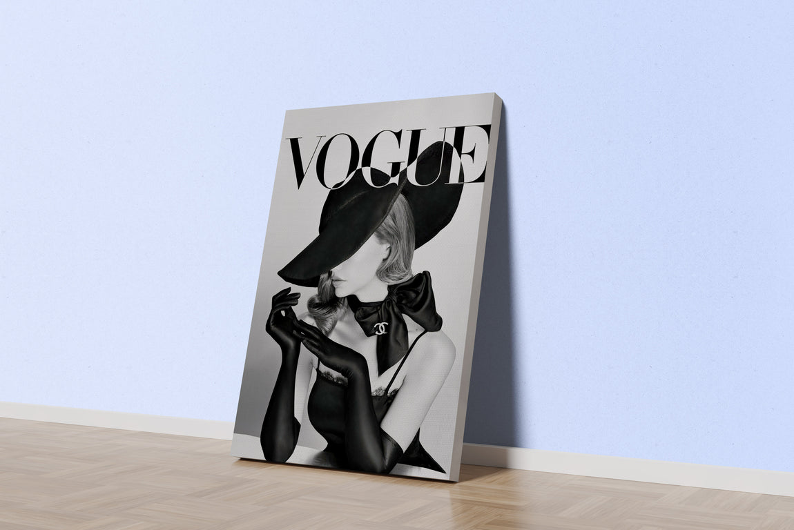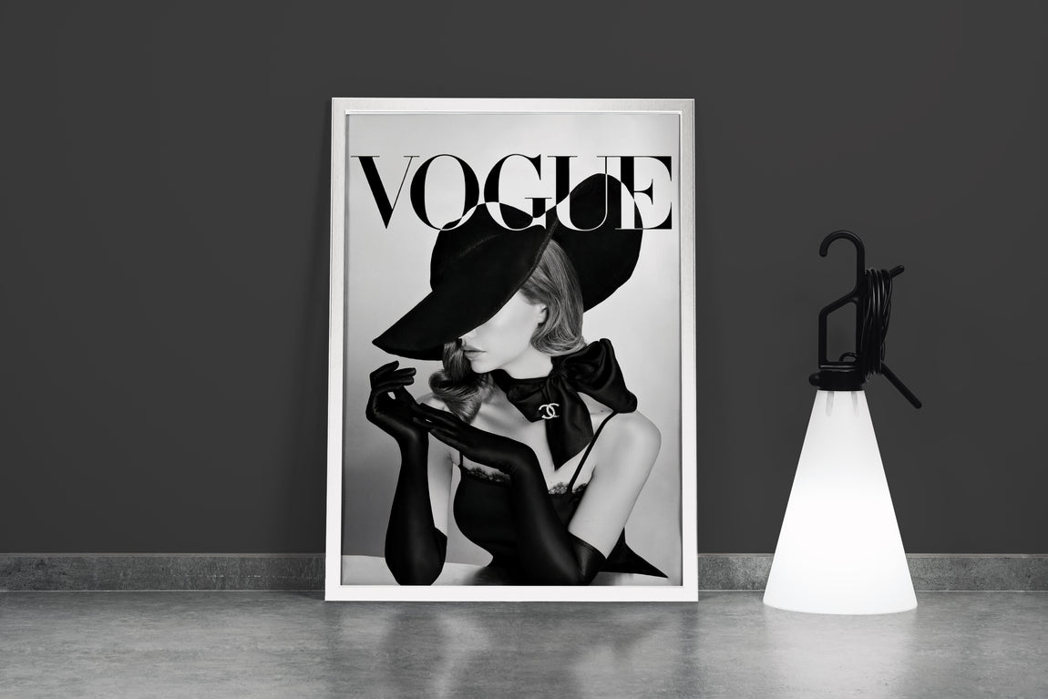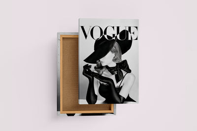 an elegant, mysterious woman in a big hat and gloves on a vogue cover, art, kanvas tablo