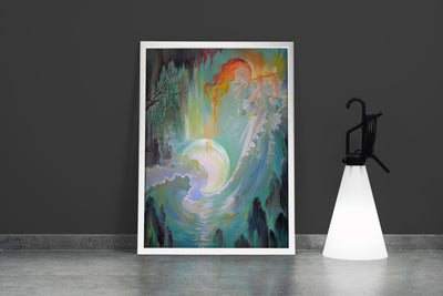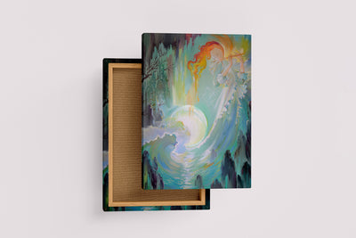 Alev saçlı mistik bir figürün, parlayan ve damlayan bir ayın yanında flüt çalmasını betimleyen bu baskı, mekanınıza eşsiz bir atmosfer katacak. Canlı renkler ve detaylı işçilik, dekorasyonunuza zarif bir dokunuş sunarken, kaliteli malzeme uzun ömürlü kullanım sağlar. Sanatseverler için özgün ve dikkat çekici bir tercih.