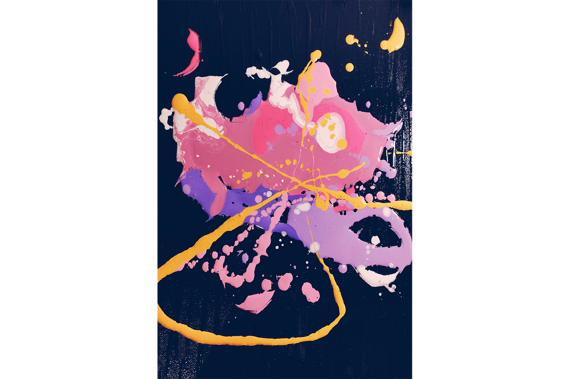 an expressive abstract painting with vibrant splashes of pink, yellow and purple paint, abstract, art, kanvas tablo