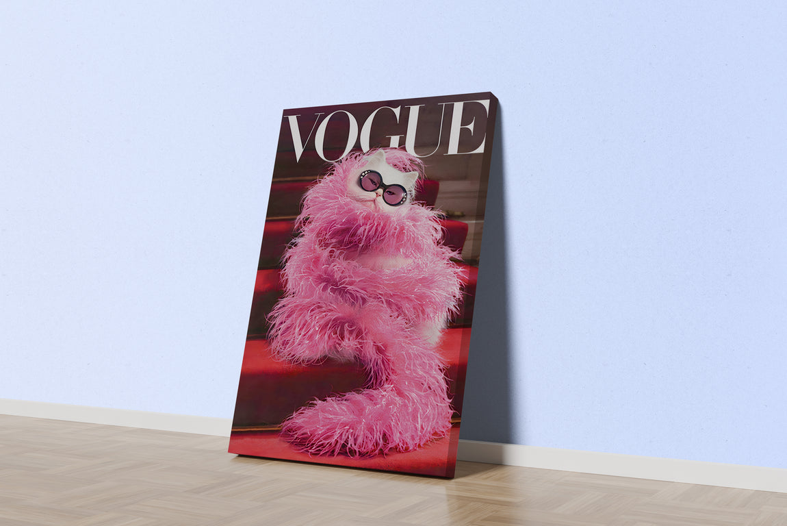 Yüksek modanın görkemli dünyasını, beklenmedik ve sevimli bir mizah anlayışıyla birleştiren bu eşsiz kanvas tablo, mekanlarınıza neşe, karakter ve sofistike bir eğlence katmak için tasarlandı. Moda dünyasının en prestijli ismi Vogue'un kapağını süsleyen bu eser, kırmızı halının tüm ciddiyetini, pembe bir tüy boa ve şık güneş gözlükleriyle poz veren havalı bir kediyle yıkarak unutulmaz bir an ortaya koyar. Bu tablo, duvarlarınızda sadece bir dekorasyon objesi değil, aynı zamanda stilin en eğlenceli halini sergileyen, gülümseten bir sanat beyanıdır.