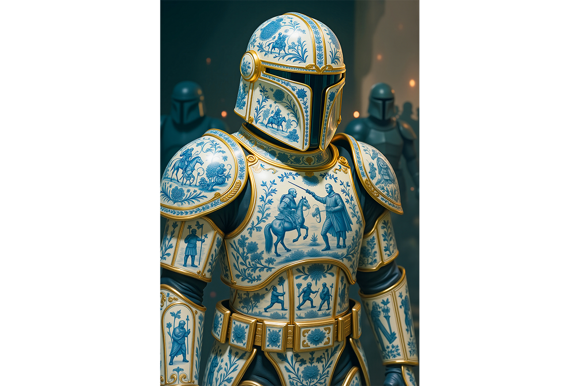 - Mavi-Beyaz Çini Desenleri: Zırhın her bir parçası, geleneksel Hollanda (Delft) veya Çin porselenlerini anımsatan, incelikle işlenmiş mavi-beyaz desenlerle kaplıdır. Bu desenler, atlı figürlerin, sakin manzaraların ve kırsal yaşamın hikayelerini anlatır. Bir bilim kurgu ikonunun, bu klasik ve dünyevi desenlerle bezenmesi, eserin en çarpıcı ve en özgün yönüdür.