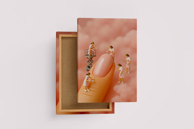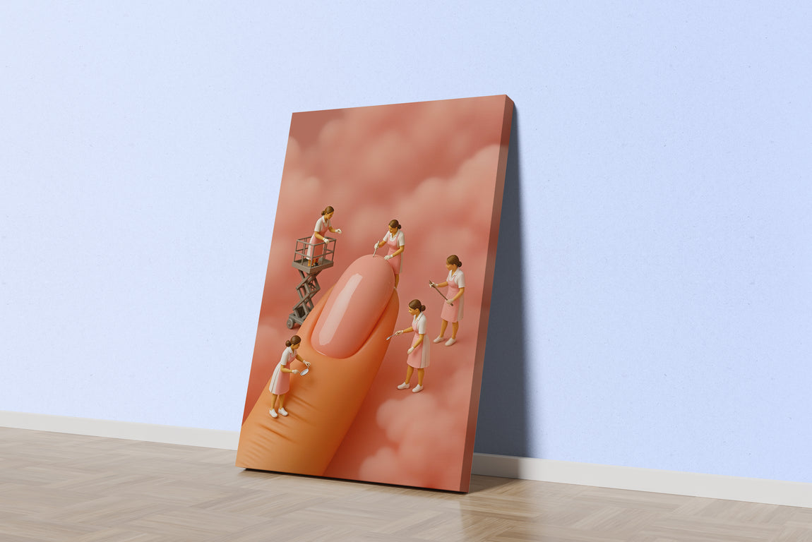 Modern konsept sanatının en zarif ve en esprili örneklerinden biri olan bu eser, şimdi mekanlarınıza hem bir stil hem de bir tebessüm katmak için kanvas tablo formunda. Bu tablo, gündelik bir güzellik ritüeli olan manikürü, minyatür figürlerin çalıştığı devasa bir sahneye dönüştürerek, hem ölçekle oynayan zeki bir sanat eseri hem de güzellik ve bakımın ardındaki o titiz emeğe yapılmış sevimli bir övgüdür.