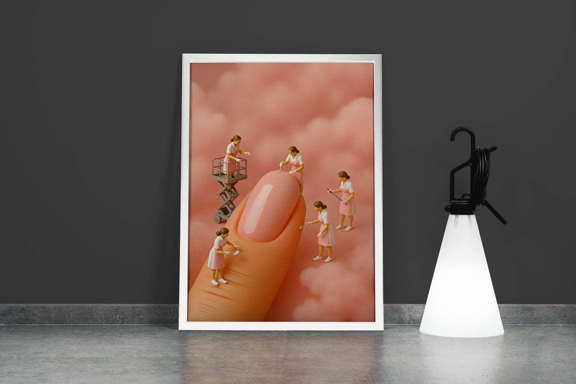 Bu eser, izleyiciyi adeta bir rüya alemine, her şeyin pamuk şekerinden bulutlarla kaplı olduğu, pembe bir dünyaya davet eder. Bu dünyanın merkezinde ise, devasa bir tırnağa özenle bakım yapan, minicik manikürcülerden oluşan bir ekip yer alır. Sanatçı, bu imkansız sahneyi, inanılmaz bir detaycılık ve gerçekçilikle betimleyerek, izleyiciyi bu fantastik anın içine çeker. Eser, "mükemmelliğe ulaşmak için verilen emek" temasını, son derece eğlenceli ve akılda kalıcı bir dille yorumlar. Bu, güzellik ve kişisel bakım rutinlerinin, aslında ne kadar büyük bir özen ve adanmışlık gerektiren birer "sanat" olduğunu gösteren, esprili bir bakış açısıdır.