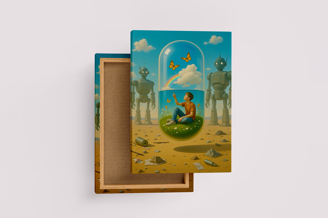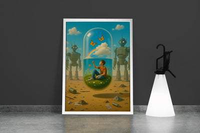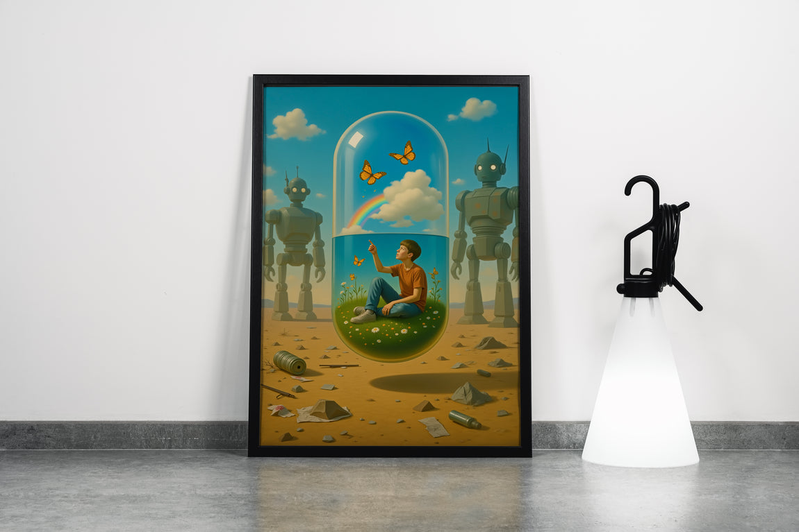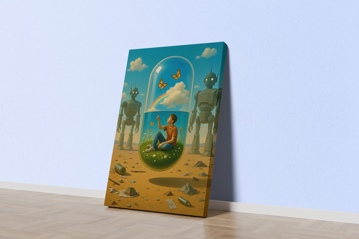 Modern konsept sanatının en dokunaklı ve en düşündürücü örneklerinden biri olan bu eser, şimdi mekanlarınıza hem görsel bir zenginlik hem de derin felsefi bir sorgulama getirmek için kanvas tablo formunda. Bu tablo, sadece bir fantezi sahnesi değil, aynı zamanda teknoloji, insanlık ve doğa arasındaki karmaşık ilişkiyi, umut dolu ve bir o kadar da hüzünlü bir dille yorumlayan, unutulmaz bir başyapıttır.