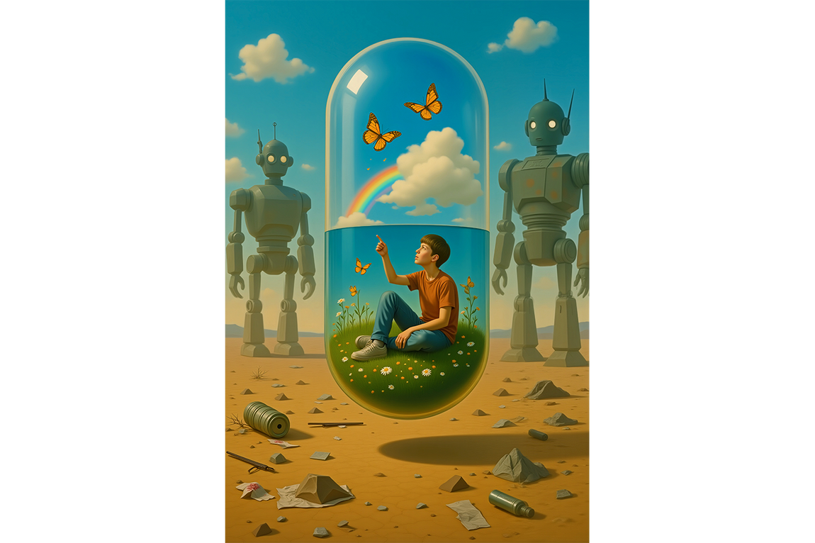 Bu dokunaklı sahneyi, iki devasa ve eski tip robot izler. Onların varlığı, esere bir gizem ve belirsizlik katmanı ekler: Bu robotlar, bu son doğa parçasının ve insanlığın koruyucuları mıdır? Yoksa bu yapay dünyanın gardiyanları, çocuğun bu kapsülden asla çıkmamasını sağlayan gardiyanlar mıdır? Bu eser, bize "Doğayı kaybedersek, onu ancak bir müze vitrininde mi görebiliriz?" ve "Teknoloji, insanlığın kurtarıcısı mı yoksa gardiyanı mı olacak?" gibi güçlü sorular sordurur.