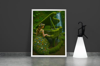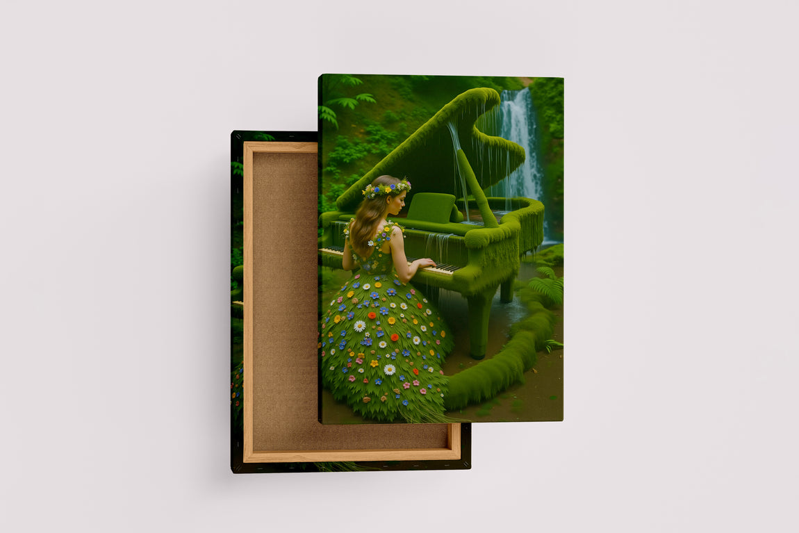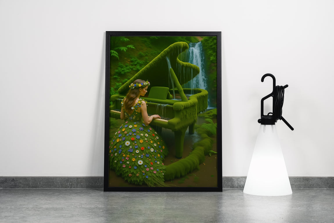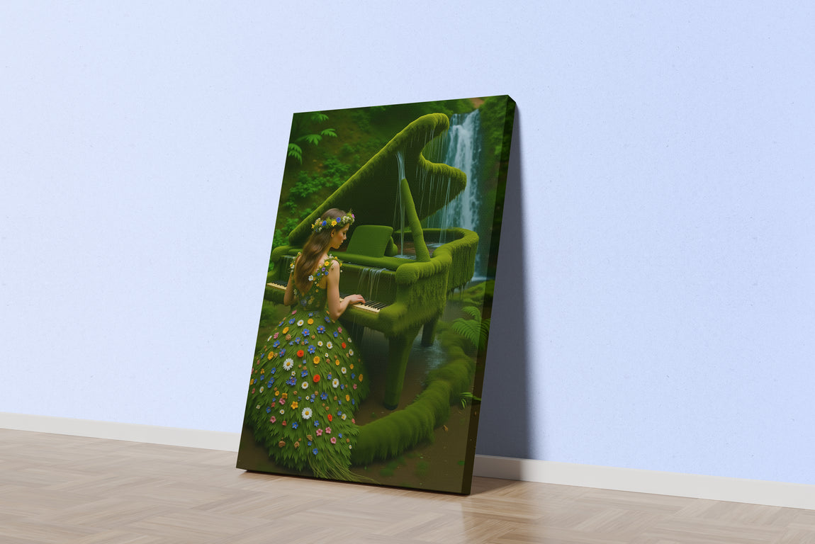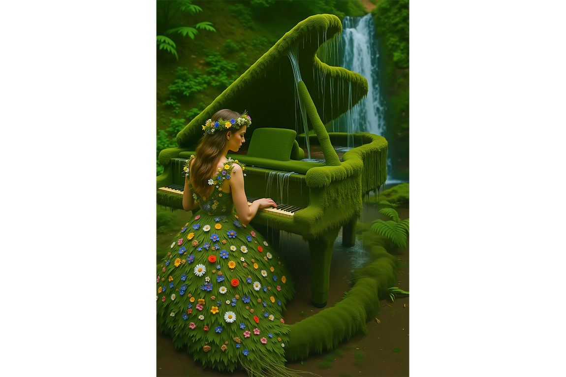 Bu eser, izleyiciyi el değmemiş, yemyeşil bir ormanın kalbinde gizlenmiş sihirli bir mekana davet eder. Gürül gürül akan bir şelalenin yanı başında, sanki yüzyıllardır oradaymış gibi yosunlarla kaplanmış görkemli bir kuyruklu piyano durur. Bu piyano, artık insan elinden çıkmış bir enstrüman değil, ormanın yaşayan, nefes alan bir parçası haline gelmiştir. Ve bu büyülü enstrümanı çalan kadın da, doğanın kendisinden doğmuş gibidir. Üzerindeki elbise, kumaştan değil, taze yapraklardan ve kır çiçeklerinden meydana gelmiştir. O, müziğiyle sadece notaları değil, aynı zamanda şelalenin sesini, rüzgarın hışırtısını ve ormanın ruhunu da dile getiren bir doğa perisi, bir ilham perisidir. Bu tablo, insan sanatının, doğanın kendisinden daha büyük bir sanat olmadığını ve en güzel melodilerin, doğayla uyum içinde yaşandığında ortaya çıktığını anlatan sessiz bir hikayedir.