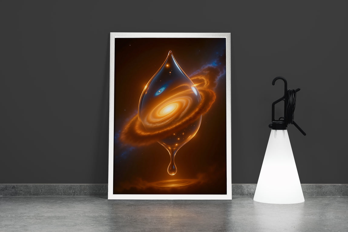 - Işık Saçan Damla: Eserin odak noktası olan damla, adeta kendi ışık kaynağıymış gibi parlar. Cam gibi pürüzsüz yüzeyi, içindeki galaksinin ışığını yansıtarak ve kırarak, esere üç boyutlu bir derinlik ve canlılık katar. Damlanın alt ucundan süzülen daha küçük damlacık, bu kozmik doğumun veya yayılımın devam ettiğini, evrenin sürekli bir akış ve dönüşüm içinde olduğunu ima eder.