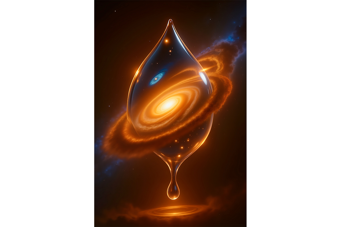 Bu eser, izleyiciyi basit ama son derece derin bir felsefi sorgulamanın içine çeker: Ya tüm evren, tüm galaksiler ve yıldızlar, bizim algımızın ötesinde, devasa bir bütünün sadece küçük bir parçası, bir su damlası kadarsa? Kompozisyonun merkezinde, uzay boşluğunda asılı duran, parlak ve kusursuz bir damla yer alır. Ancak bu sıradan bir damla değildir; içinde, altın rengi ışıkla parlayan, sarmal kollara sahip görkemli bir galaksiyi barındırır. Bu, hayatın başlangıcını, bir "ilk damla"yı veya tüm varoluşun tek bir özden doğduğu fikrini simgeleyen güçlü bir metafordur. Eser, izleyiciye hem evrenin ne kadar büyük ve görkemli olduğunu hem de her bir parçanın o büyük bütünün özünü nasıl taşıdığını hatırlatır.