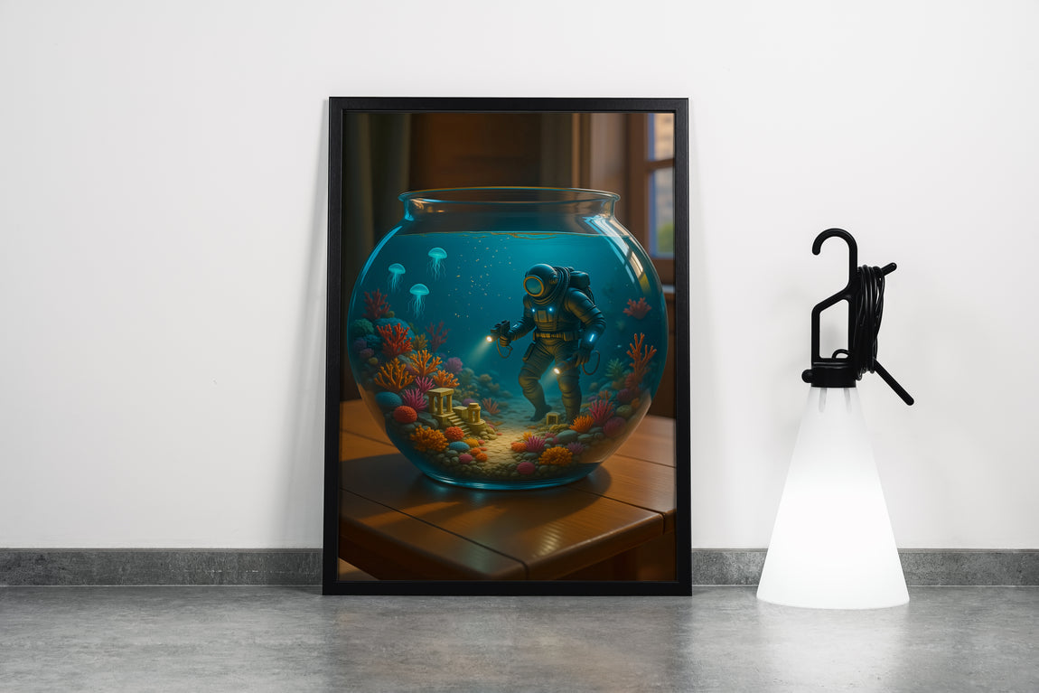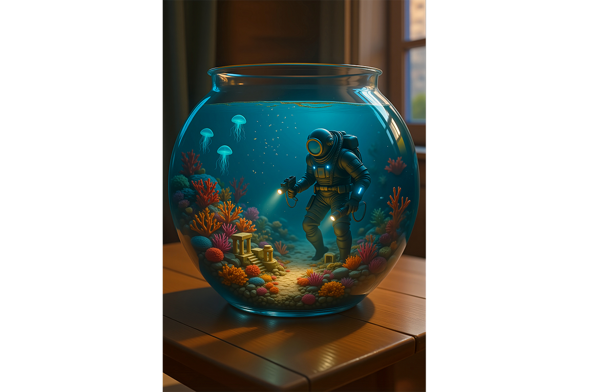 Bu eser, izleyiciye ilk bakışta basit bir soru sorar: Bir fanusun içine ne sığabilir? Sanatçı, bu soruya, "bütün bir okyanus" cevabını vererek, hayal gücünün sınırlarını zorlar. Eser, bir masanın üzerinde duran sıradan bir cam fanusu betimler. Ancak bu fanusun içinde, rengarenk mercanlarla, parlayan denizanalarıyla ve hatta antik kalıntılarla dolu, capcanlı bir sualtı dünyası yer alır. Bu minyatür okyanusun içinde ise, eski tip bir dalgıç kıyafetiyle, elinde feneriyle bu gizemli dünyayı keşfeden bir kaşif bulunur.