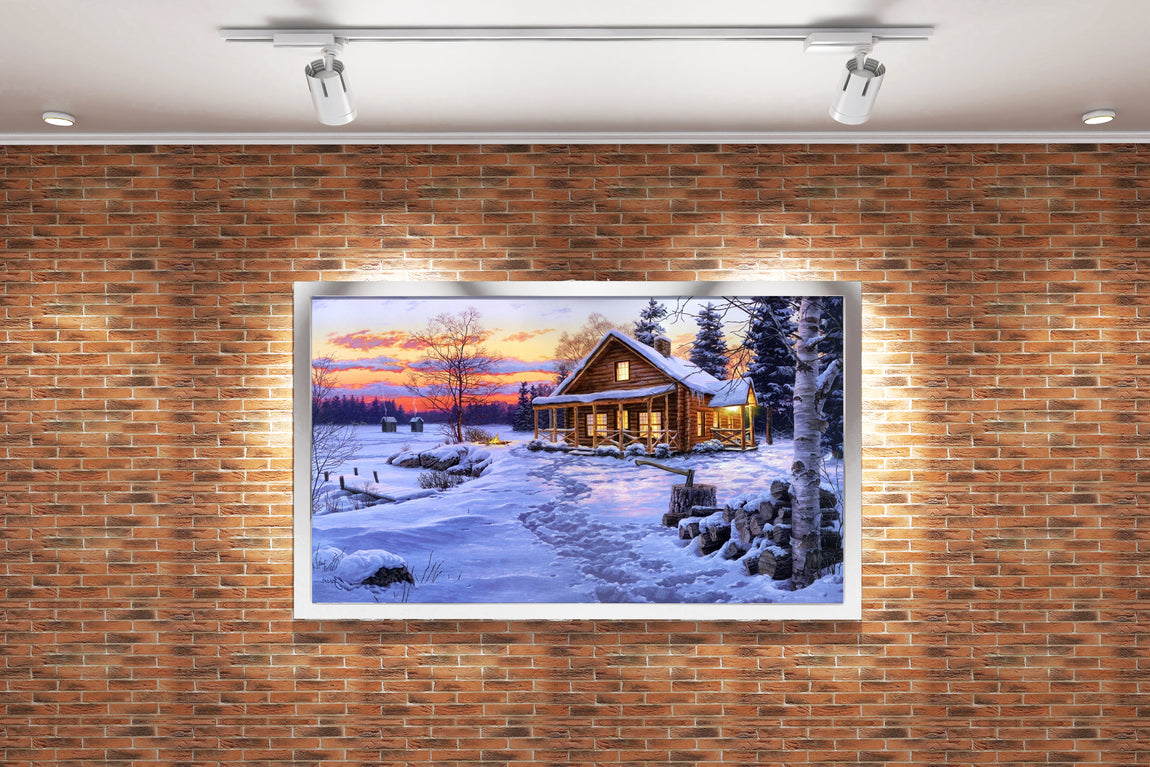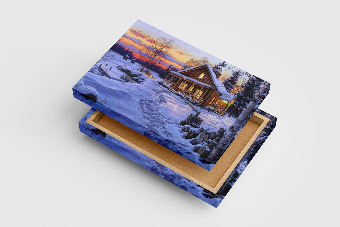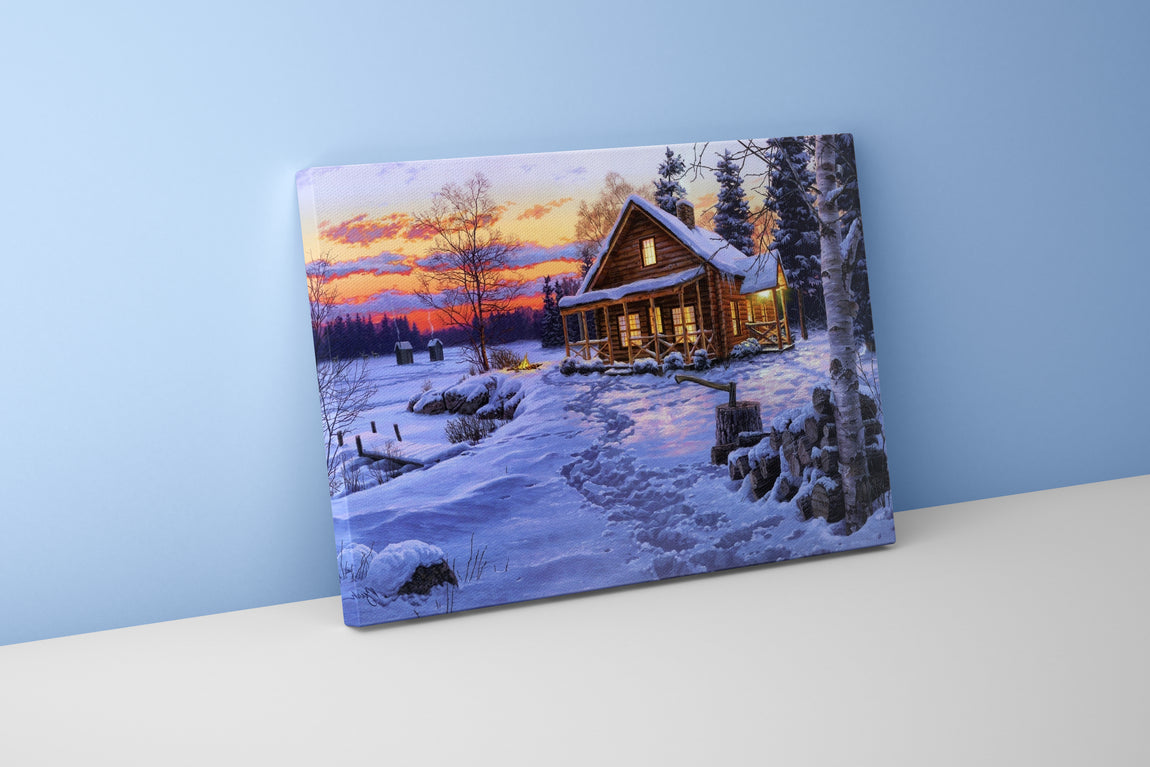 Kar beyazının üzerinde kalan ayak izleri, gün batımında sıcak ışıklarla parlayan samimi bir kulübeye uzanıyor. Yüksek kaliteli baskı tekniğiyle hayat bulan bu görsel, mekanınıza huzur ve sıcaklık katmak için ideal. Detayları özenle yansıtması sayesinde, her baktığınızda size doğal ve dingin bir atmosfer sunar. Dekorasyonunuza zarif ve anlamlı bir dokunuş eklemeye ne dersiniz?