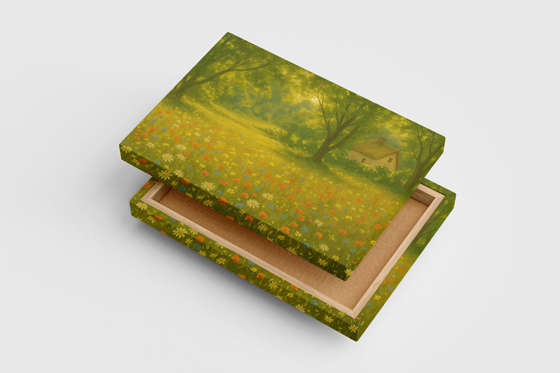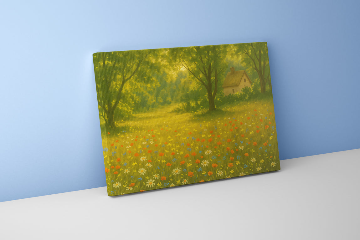 Doğanın huzur dolu atmosferini evinize taşıyan bu baskı, küçük bir kulübe ve etrafını saran çiçeklerin zarif detaylarını yansıtıyor. Kaliteli kanvas yüzeyde yüksek çözünürlükte gerçekleştirilen baskı, uzun ömürlü renkler ve netlik sunar. Yaşam alanınıza sıcaklık ve dinginlik katarken, doğa tutkunları için ideal bir dekorasyon seçeneği olmayı vaat eder.