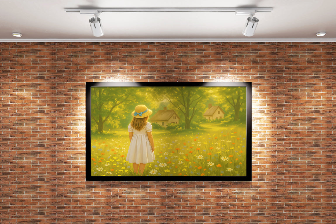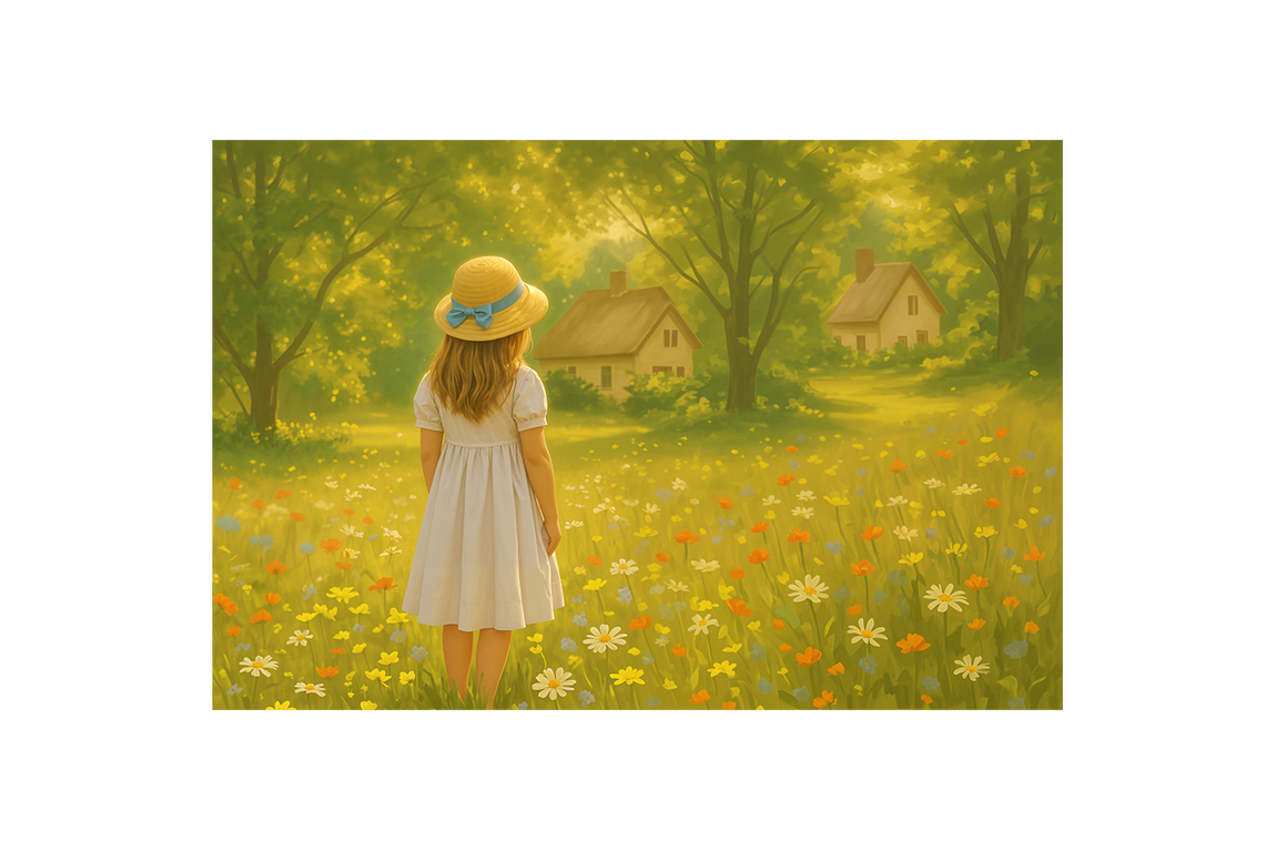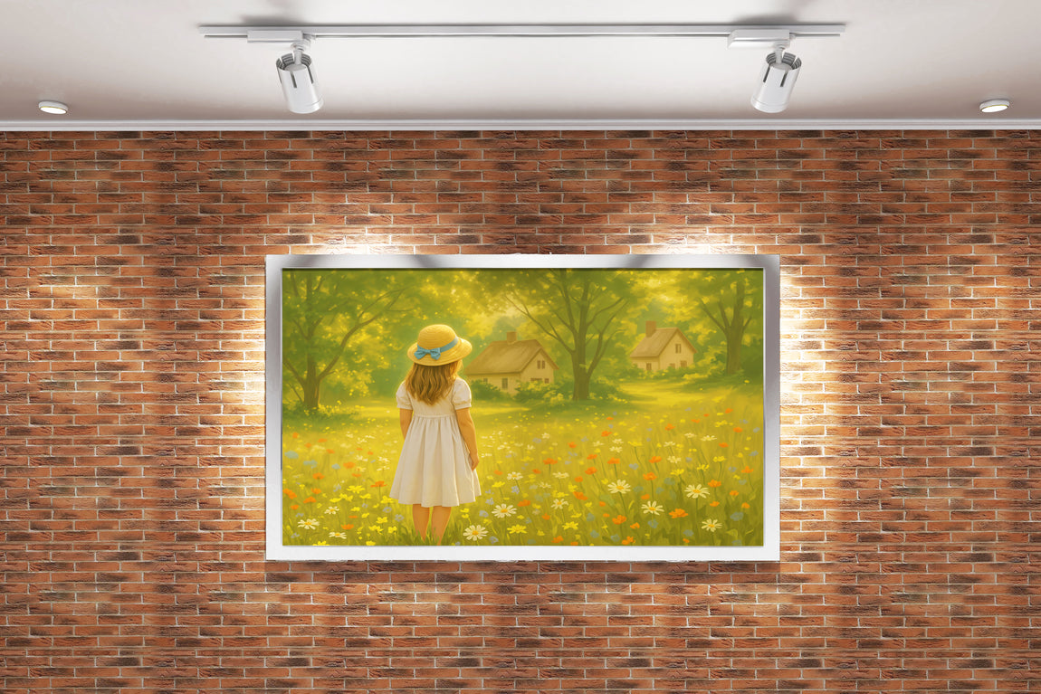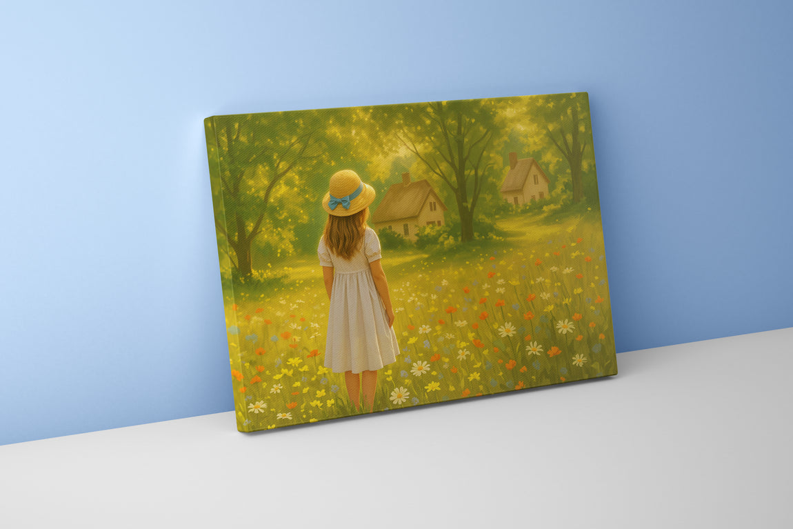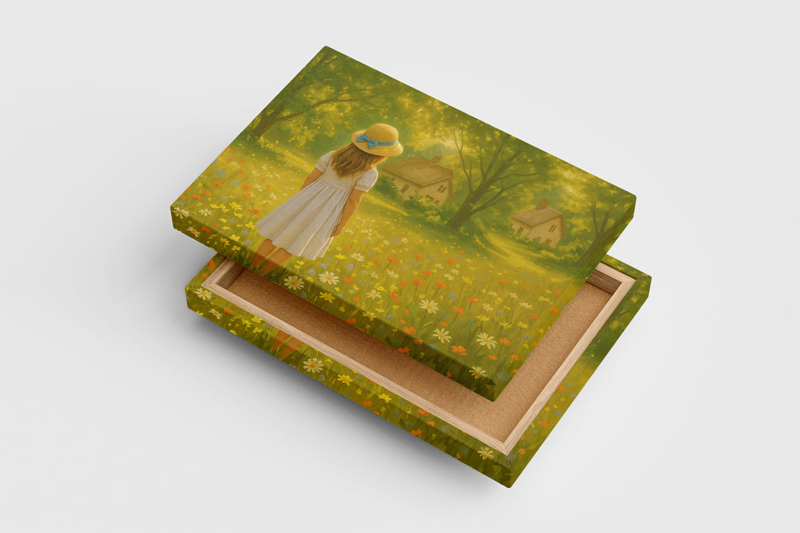 Doğa ve küçük bir kulübeyi çiçeklerle çevrili, şapkalı küçük bir kızın bulunduğu bu baskı, yaşam alanlarınıza huzur dolu bir atmosfer katıyor. Yüksek kaliteli baskı tekniğiyle detaylar net ve canlı renklerle öne çıkarak dekorasyonunuza zarif bir dokunuş sağlar. Kalıcı ve dayanıklı malzemeler üzerine uygulandığı için uzun süre ilk günkü görünümünü korur. Evinizi veya ofisinizi güzelleştirmek için ideal bir seçim.