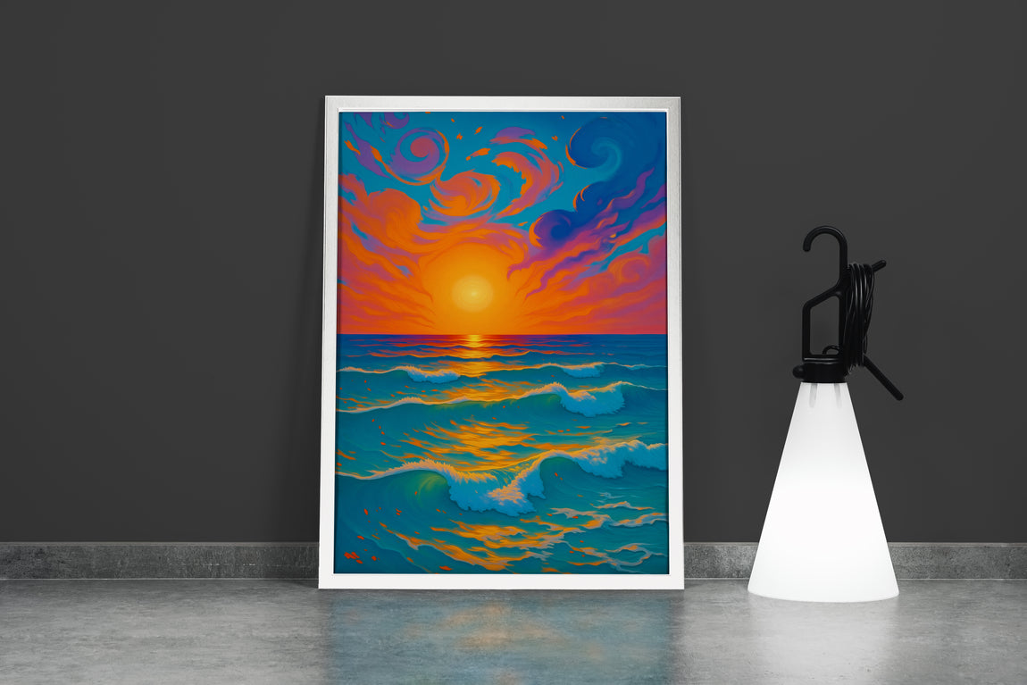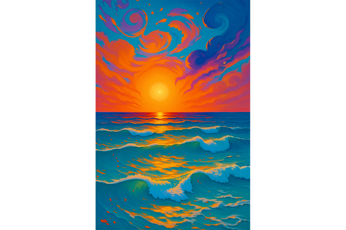 Bu eser, izleyiciyi doğanın en güçlü iki elementinin, gökyüzü ve denizin, renk ve hareket dolu diyaloğuna tanıklık etmeye davet eder. Kompozisyon, iki ana bölümden oluşur: Üst yarıda, adeta bir alev topu gibi parlayan güneşin etrafında dönen, fırça darbeleriyle hayat bulmuş girdaplı bulutlar; alt yarıda ise bu göksel şölenin renklerini yansıtan, hareketli ve canlı okyanus dalgaları. Sanatçı, bu eserde doğanın o anlık ve geçici güzelliğini, renkleri en cesur ve en canlı halleriyle kullanarak yakalamayı hedefler. Bu, sadece bir gün batımı değil, aynı zamanda bir enerji patlaması, bir duygu yoğunluğu ve doğanın o durdurulamaz gücüne yapılmış bir övgüdür.