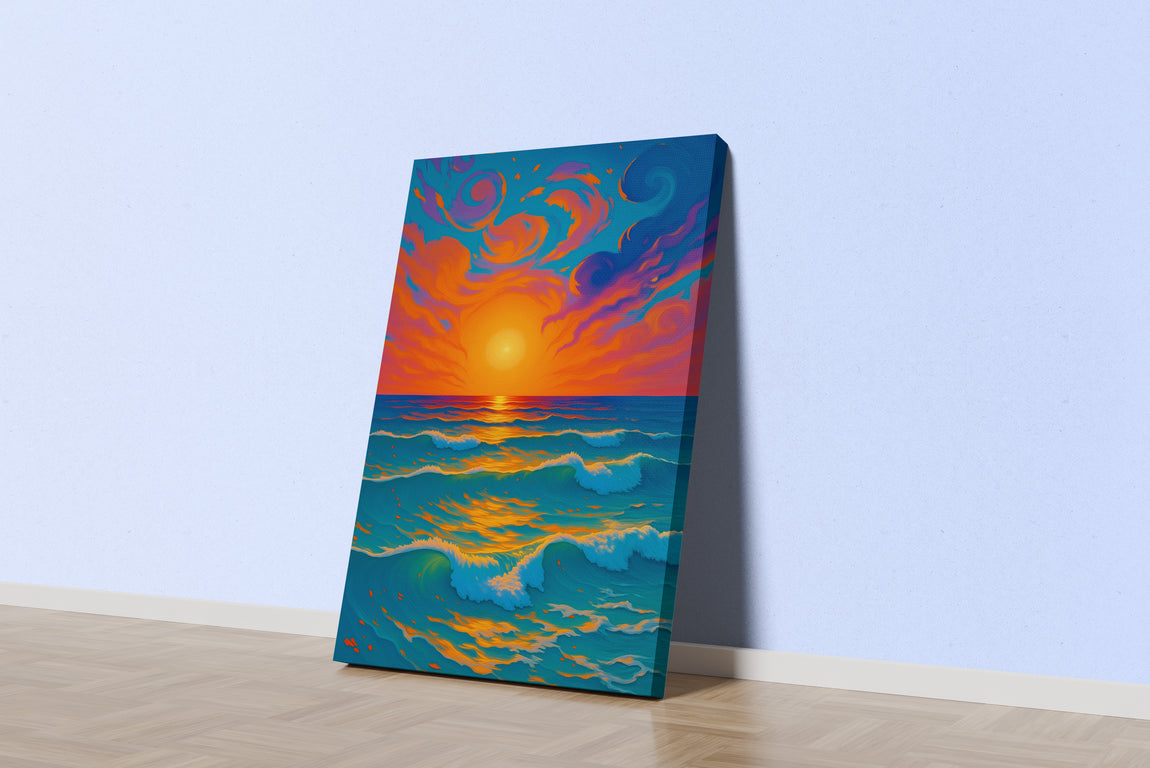 Girdaplı Gökyüzü Altında Gün Batımı ve Okyanus Dalgaları Renkli Deniz Manzarası Kanvas Tablo