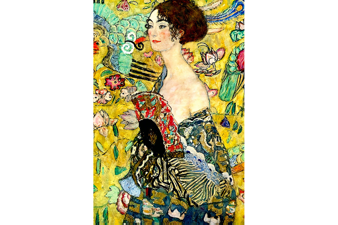 Eserde, elinde yelpaze tutan genç bir kadın betimlenmiştir. Kadının arkasındaki zengin desenli ve altın tonlarının hâkim olduğu arka plan, Klimt’in sanatında sıklıkla karşımıza çıkan oryantal ve dekoratif etkileri gözler önüne serer. Kadının zarif duruşu, hafif tebessümü ve detaylı desenlerle bezeli giysisi, tabloya hem sofistike hem de büyüleyici bir atmosfer kazandırır. Klimt’in kadın figürlerine yüklediği anlam, bu eserde de güçlü bir şekilde hissedilir.