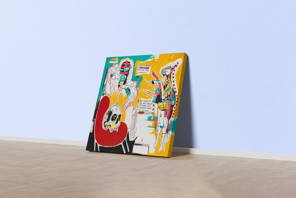 - Koltuktaki Kurukafa: Kompozisyonun solunda, kırmızı bir koltuğa oturmuş olan kurukafa figürü, Basquiat'nın en bilinen motiflerinden biridir. Bu, hem bir "memento mori" (ölümü hatırla) uyarısıdır hem de sanatçının tarih, ölüm ve yaşam döngüsü üzerine yaptığı bir yorumdur. Bu figür, sahnedeki canlı ve kaotik anın sessiz, bilge ve belki de tekinsiz bir tanığıdır.
