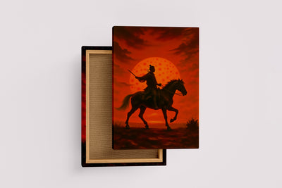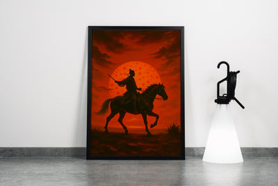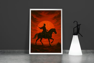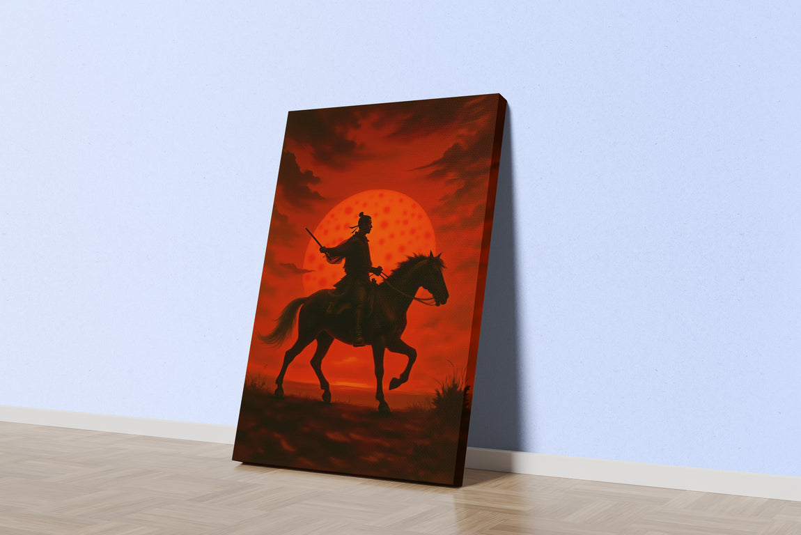 Kızıl Güneş Önünde Atlı Samuray Savaşçısı Silüeti Japon Temalı Dekoratif Kanvas Tablo