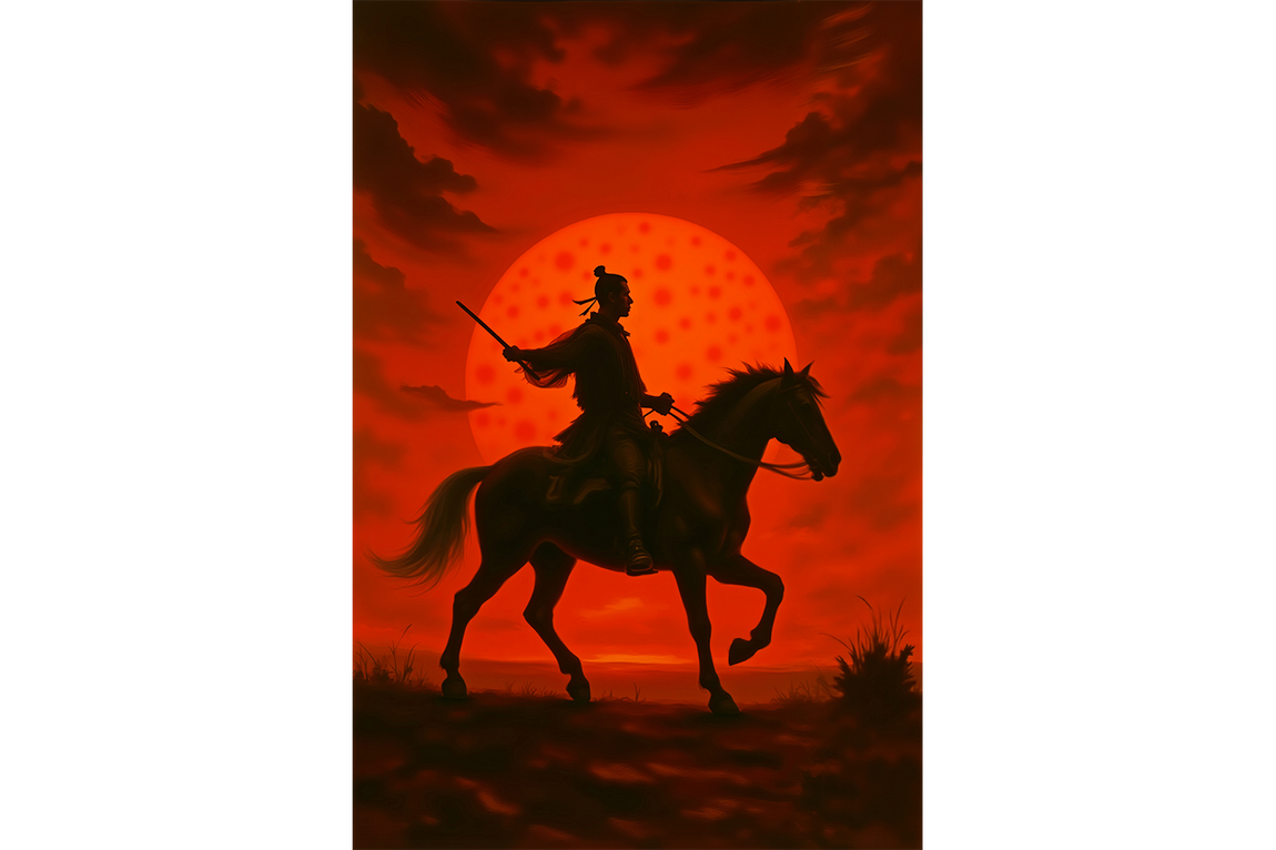 Bu eser, izleyiciyi bir anlık tefekkür anına, bir savaşçının yolculuğundaki sessiz bir molaya davet eder. Kompozisyonun merkezinde, atının üzerinde dimdik duran, mızrağını elinde tutan bir samuray figürü yer alır. Ancak bu figür, detaylarıyla değil, güçlü bir silüet olarak betimlenmiştir. Bu, onu belirli bir kişiden çıkarıp, "Bushido" olarak bilinen savaşçı felsefesini ve o onurlu yaşam tarzını benimsemiş herkesin evrensel bir sembolü haline getirir. Arka plandaki devasa ve ateş kırmızısı güneş, sahneye hem dramatik bir güç hem de ruhani bir atmosfer katar. Bu, bir gün doğumu mu yoksa bir gün batımı mı? Bir yolculuğun başlangıcı mı, yoksa sonu mu? Sanatçı, bu soruları açık bırakarak, izleyicinin esere kendi anlamını yüklemesine olanak tanır.