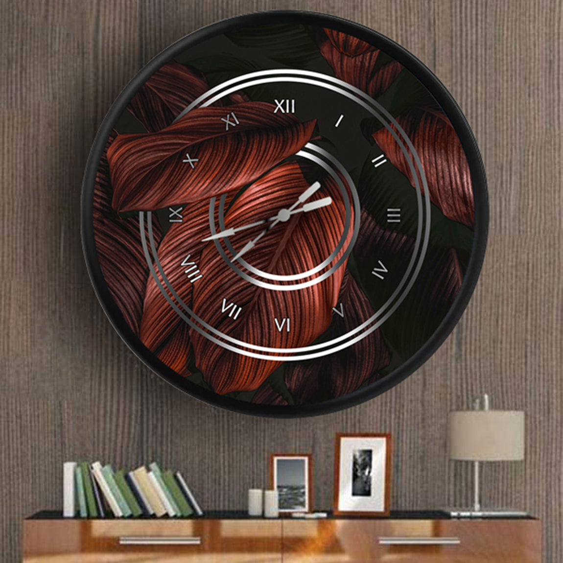 koyu bakır rengi damarlı yapraklar, MDF duvar saati